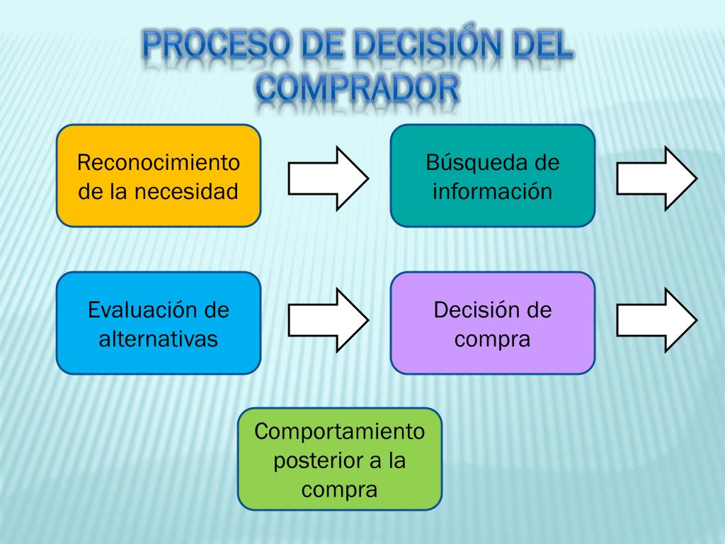 Proceso de decisión del comprador Reconocimiento de la necesidad Búsqueda de información Evaluación de alternativas Decisión de compra Comportamiento posterior a la compra