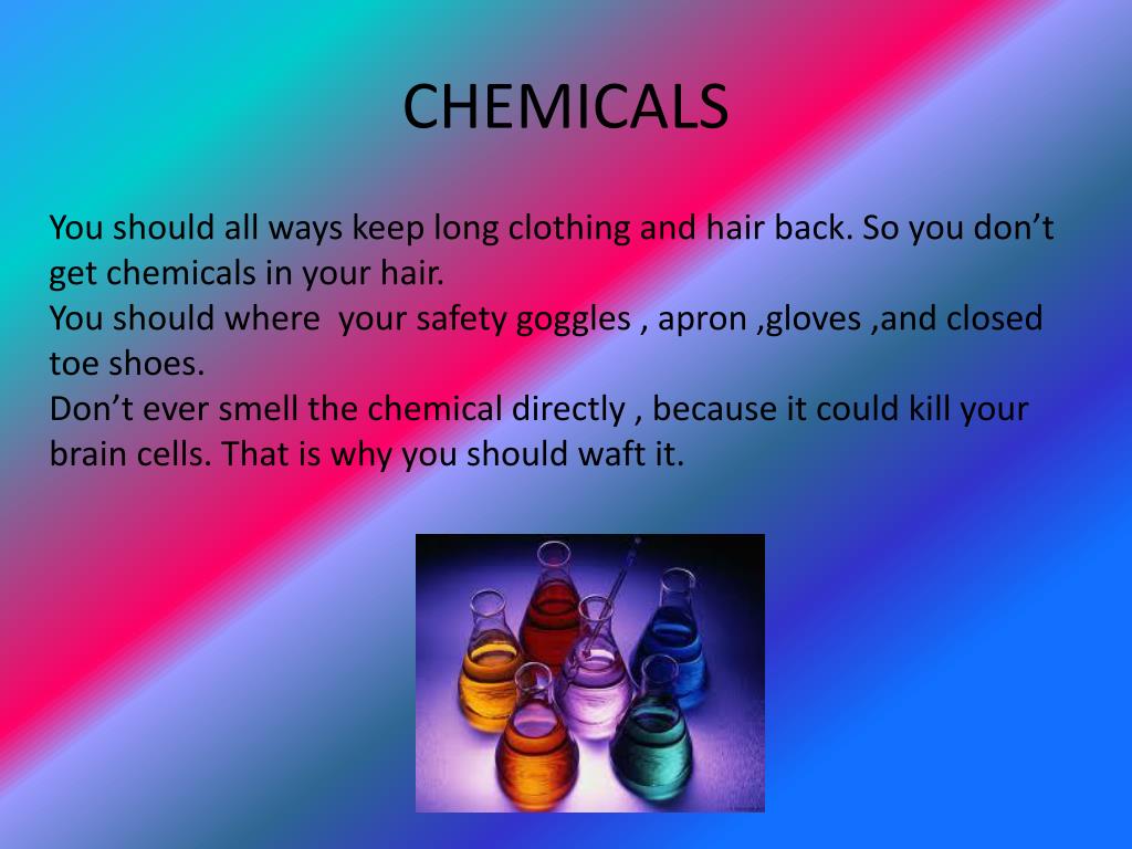 CHEMICALS You should all ways keep long clothing and hair back. So you don’t get chemicals in your hair. You should where your safety goggles , apron ,gloves ,and closed toe shoes. Don’t ever smell the chemical directly , because it could kill your brain cells. That is why you should waft it.
