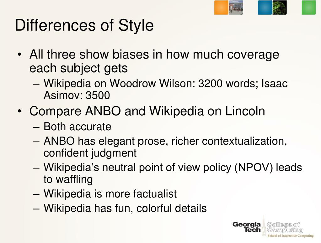 Differences of Style • All three show biases in how much coverage each subject gets • Wikipedia on Woodrow Wilson: 3200 words; Isaac Asimov: 3500 • Compare ANBO and Wikipedia on Lincoln • Both accurate • ANBO has elegant prose, richer contextualization, confident judgment • Wikipedia’s neutral point of view policy (NPOV) leads to waffling • Wikipedia is more factualist • Wikipedia has fun, colorful details