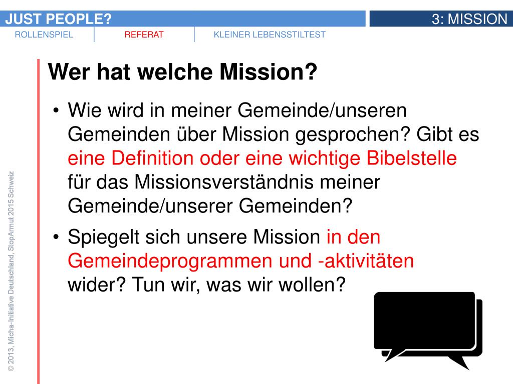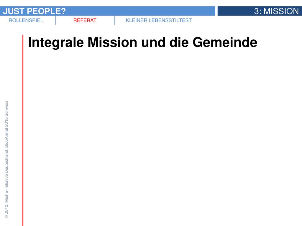 Diskussion • Was ist Gottes Mission mit dieser Welt? Oder was sind verschiedene Aspekte von Gottes Mission? • Gibt es Aspekte unserer Mission, die wichtiger sind als andere? • Ist das Missionsverständnis unserer Gemeinde(n) integral? Falls nein: Was fehlt? • Wenn Jesus Mitglied unserer Gemeinde wäre, bei welchen Gemeindeprojekten und -anlässen würde er sich wohl am ehesten engagieren? Warum?