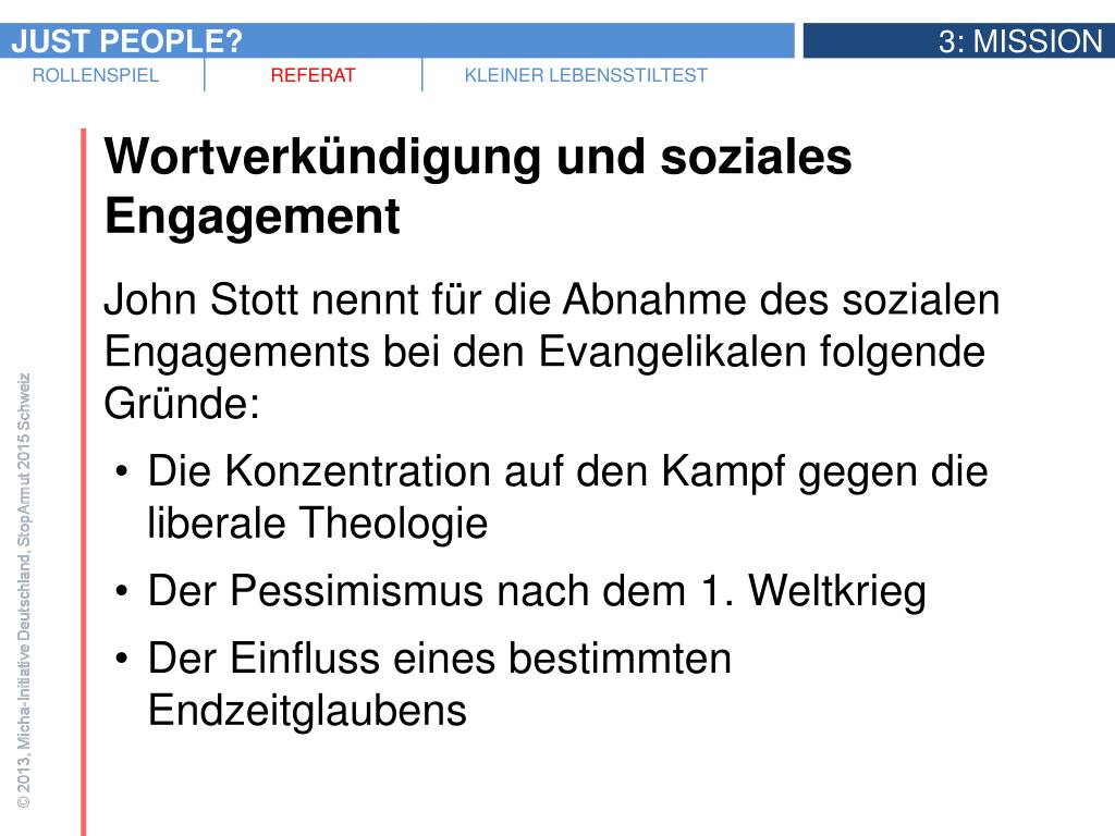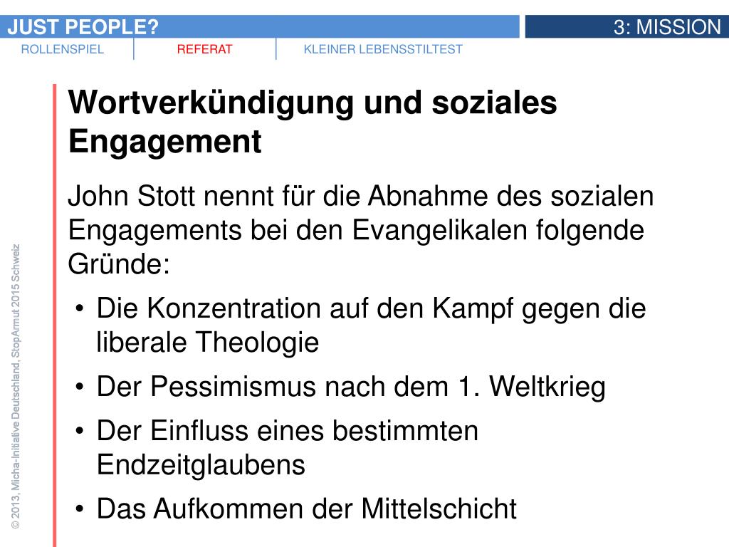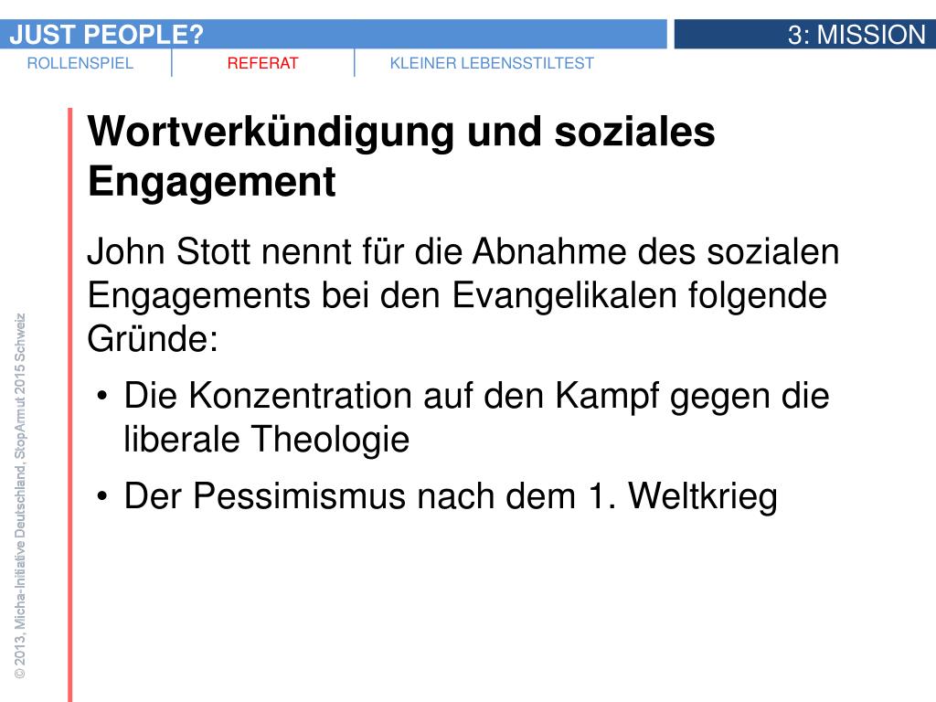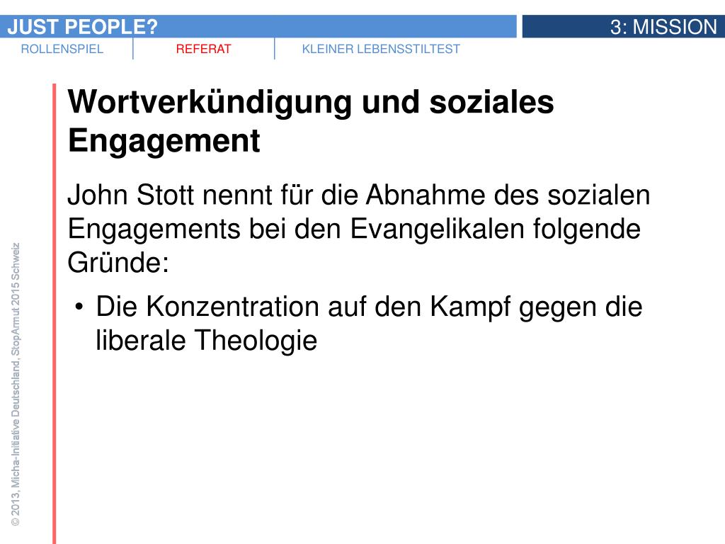 Wortverkündigung und soziales Engagement • John Stott nennt für die Abnahme des sozialen Engagements bei den Evangelikalen folgende Gründe: • Die Konzentration auf den Kampf gegen die liberale Theologie • Der Pessimismus nach dem 1. Weltkrieg • Der Einfluss eines bestimmten Endzeitglaubens