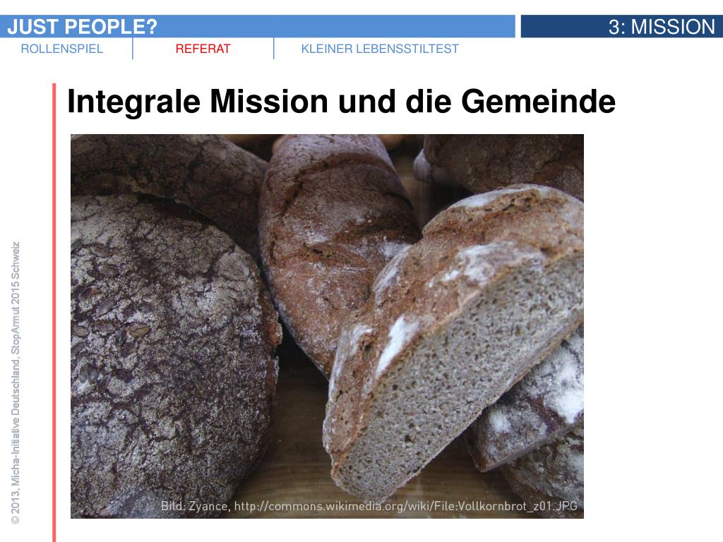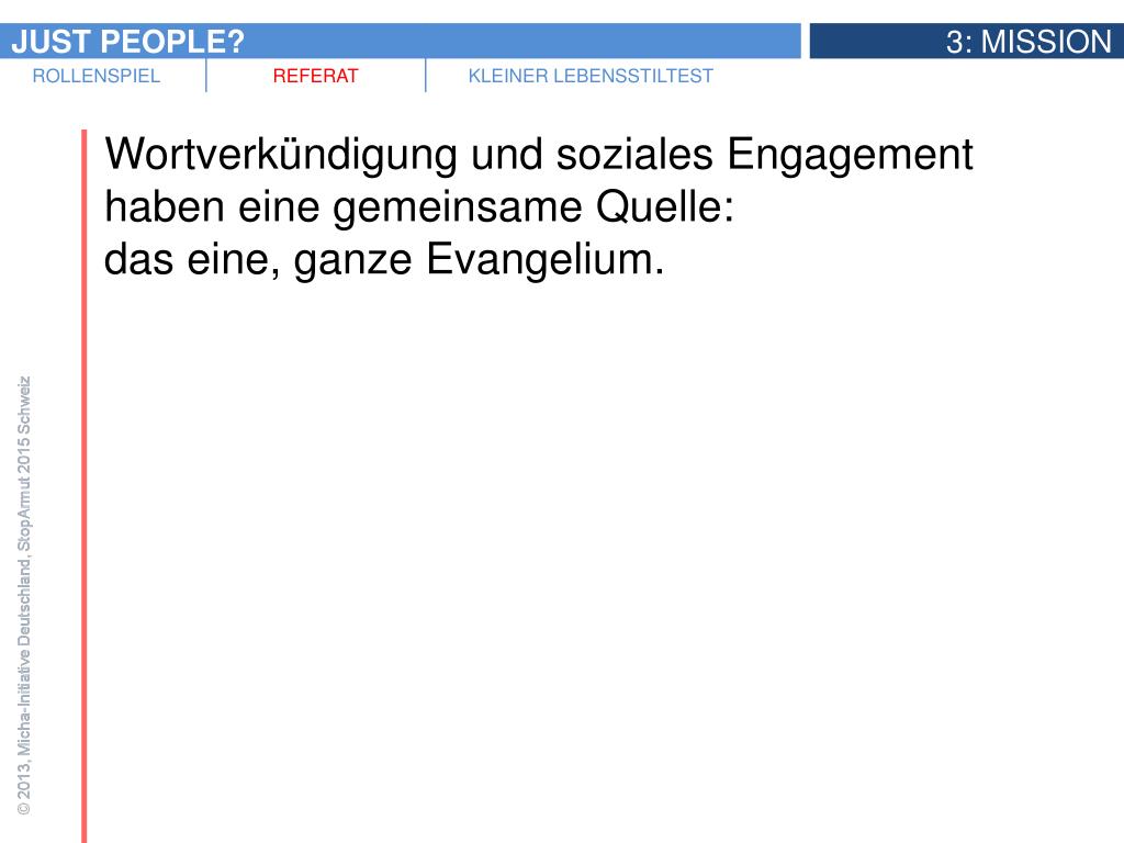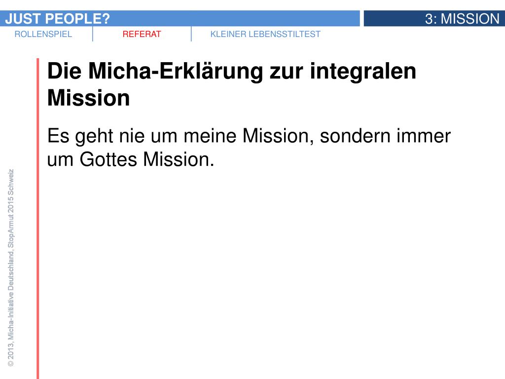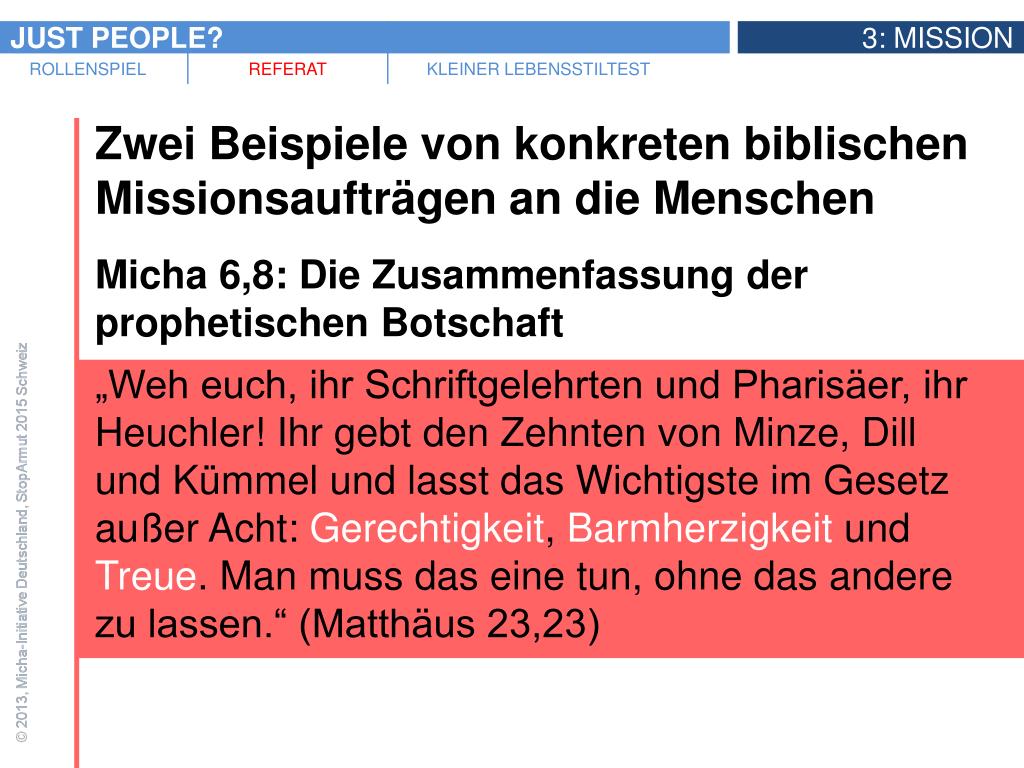 Zwei Beispiele von konkreten biblischen Missionsaufträgen an die Menschen • Micha 6,8: Die Zusammenfassung der prophetischen Botschaft • „Weh euch, ihr Schriftgelehrten und Pharisäer, ihr Heuchler! Ihr gebt den Zehnten von Minze, Dill und Kümmel und lasst das Wichtigste im Gesetz außer Acht: Gerechtigkeit, Barmherzigkeit und Treue. Man muss das eine tun, ohne das andere zu lassen.“ (Matthäus 23,23)