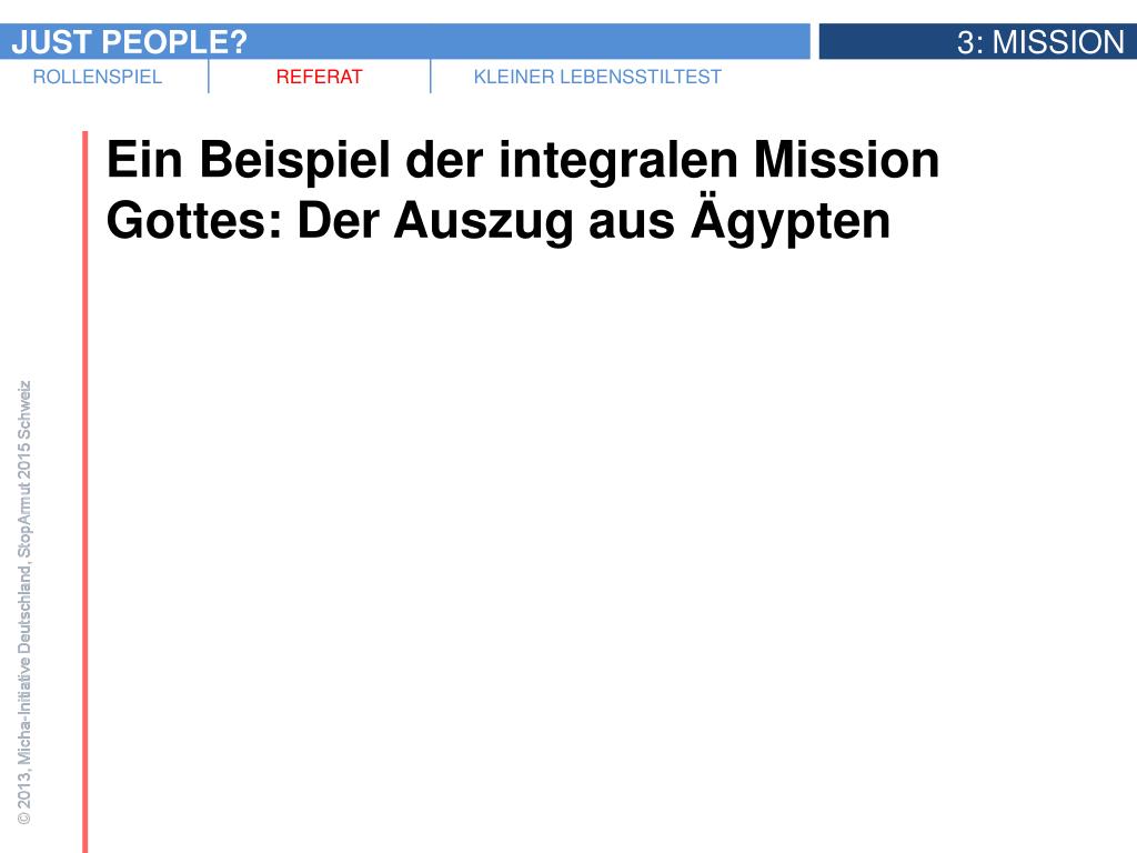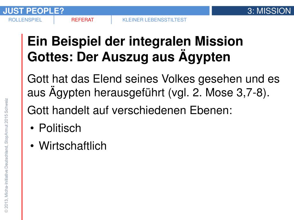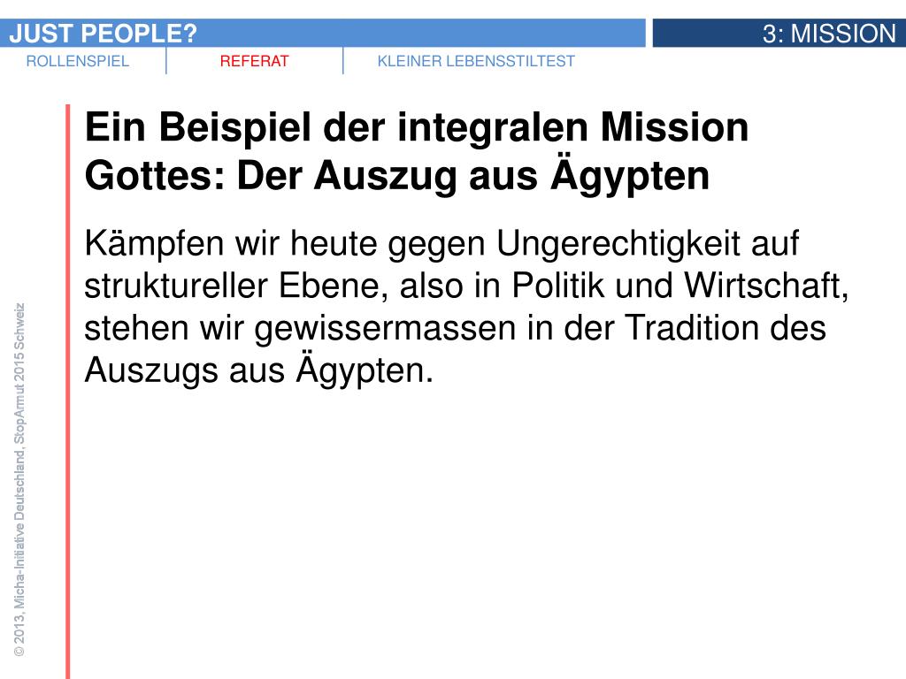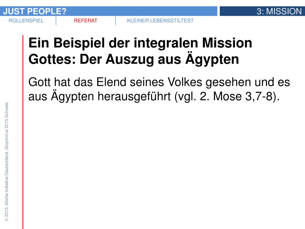 Ein Beispiel der integralen Mission Gottes: Der Auszug aus Ägypten • Kämpfen wir heute gegen Ungerechtigkeit auf struktureller Ebene, also in Politik und Wirtschaft, stehen wir gewissermassen in der Tradition des Auszugs aus Ägypten.