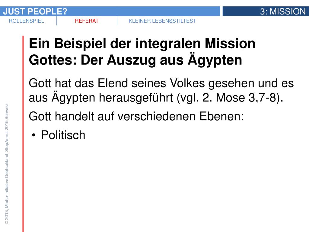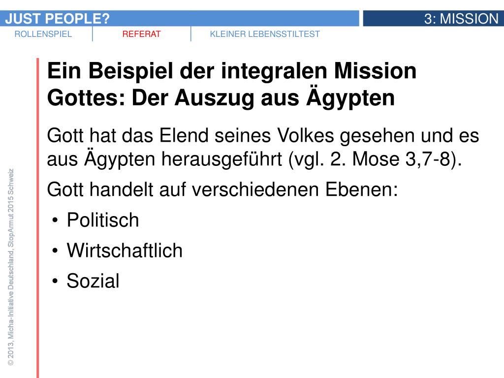 Ein Beispiel der integralen Mission Gottes: Der Auszug aus Ägypten • Gott hat das Elend seines Volkes gesehen und es aus Ägypten herausgeführt (vgl. 2. Mose 3,7-8). • Gott handelt auf verschiedenen Ebenen: • Politisch • Wirtschaftlich
