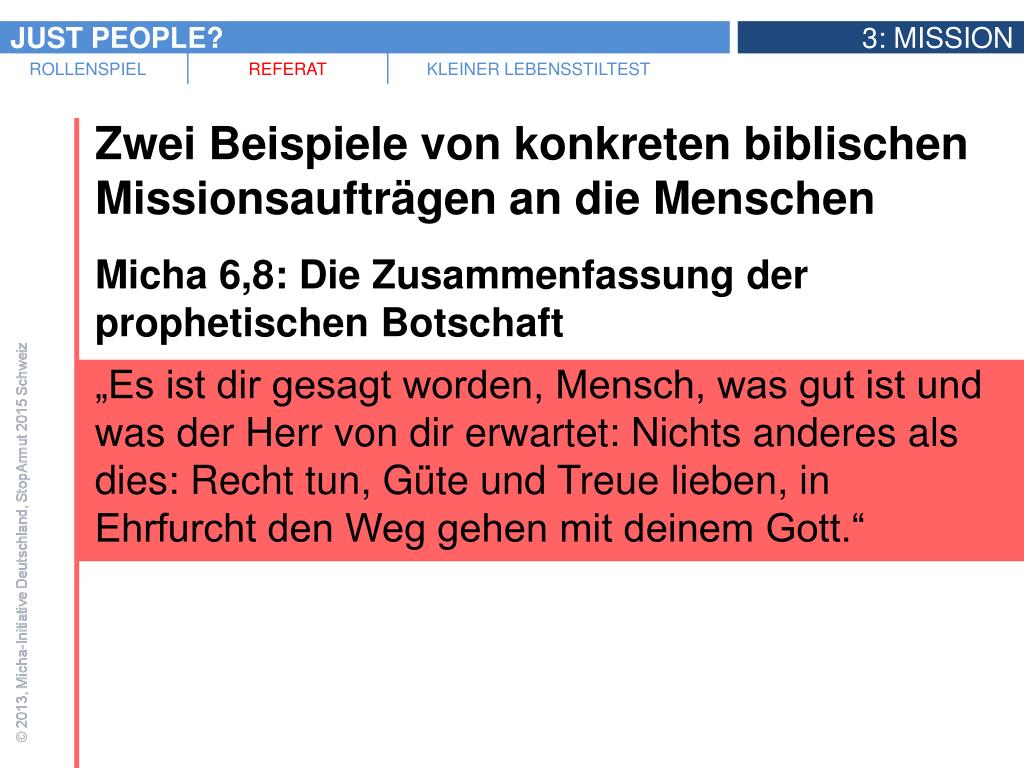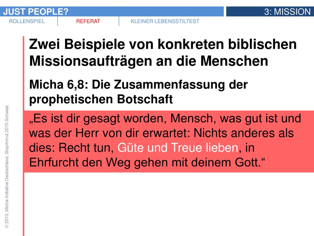 Zwei Beispiele von konkreten biblischen Missionsaufträgen an die Menschen • Micha 6,8: Die Zusammenfassung der prophetischen Botschaft • „Es ist dir gesagt worden, Mensch, was gut ist und was der Herr von dir erwartet: Nichts anderes als dies: Recht tun, Güte und Treue lieben, in Ehrfurcht den Weg gehen mit deinem Gott.“
