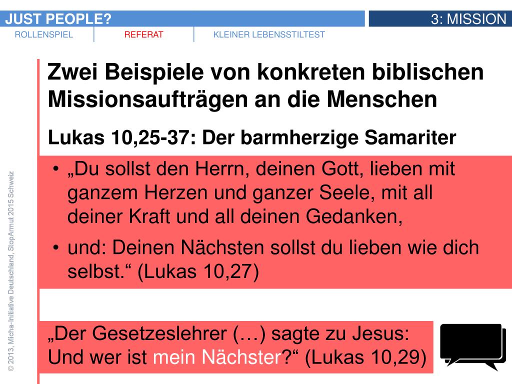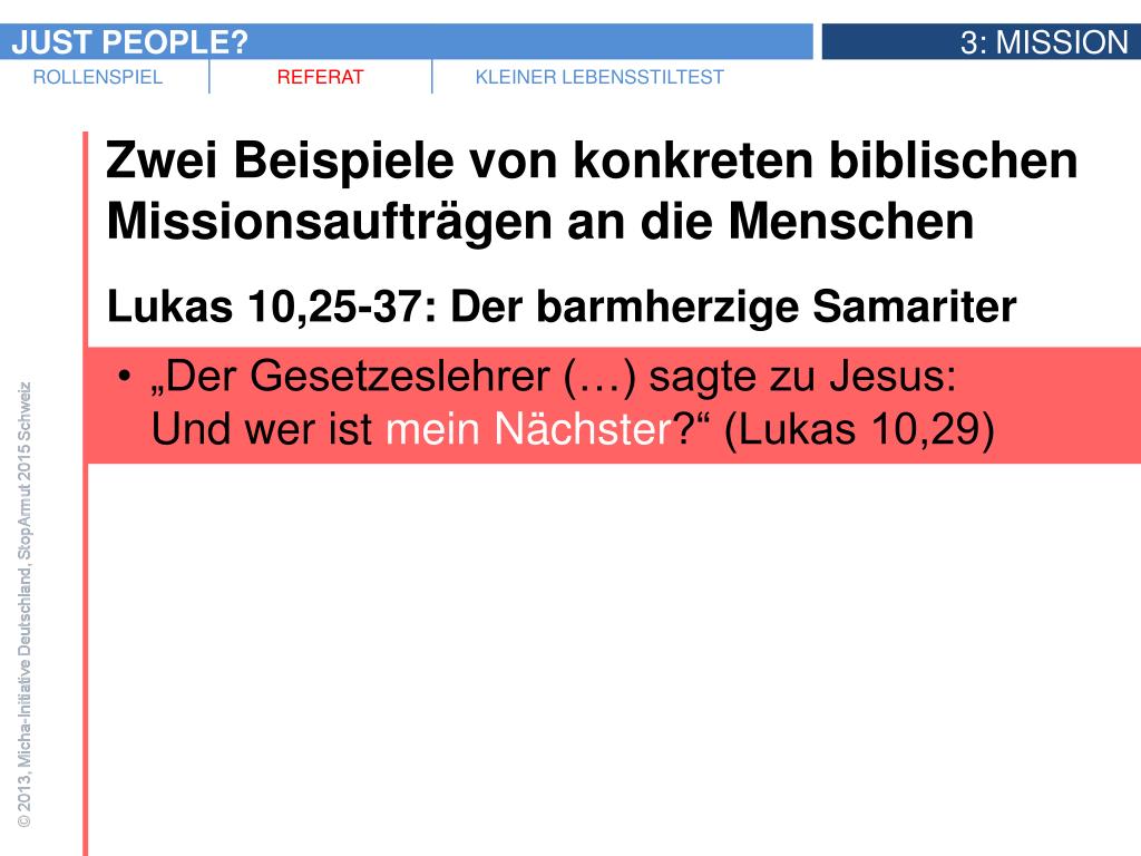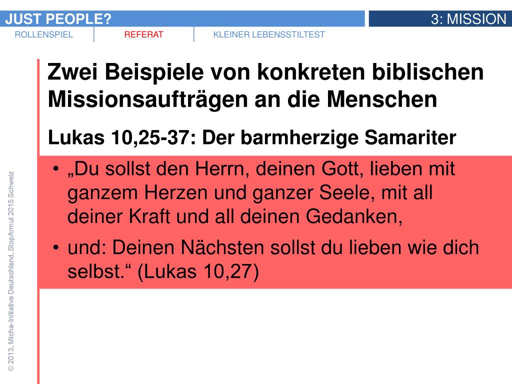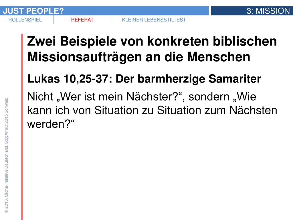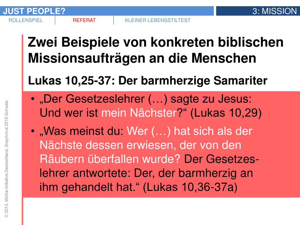 Zwei Beispiele von konkreten biblischen Missionsaufträgen an die Menschen • Lukas 10,25-37: Der barmherzige Samariter • „Du sollst den Herrn, deinen Gott, lieben mit ganzem Herzen und ganzer Seele, mit all deiner Kraft und all deinen Gedanken, • und: Deinen Nächsten sollst du lieben wie dich selbst.“ (Lukas 10,27) • „Der Gesetzeslehrer (…) sagte zu Jesus: Und wer ist mein Nächster?“ (Lukas 10,29)