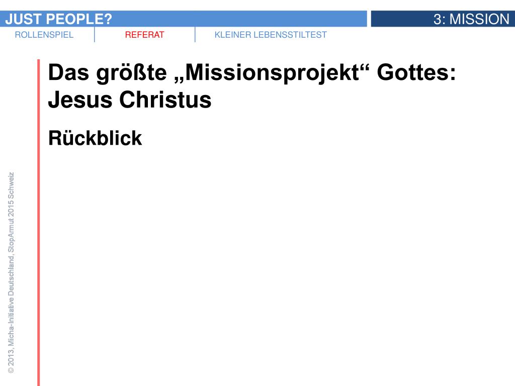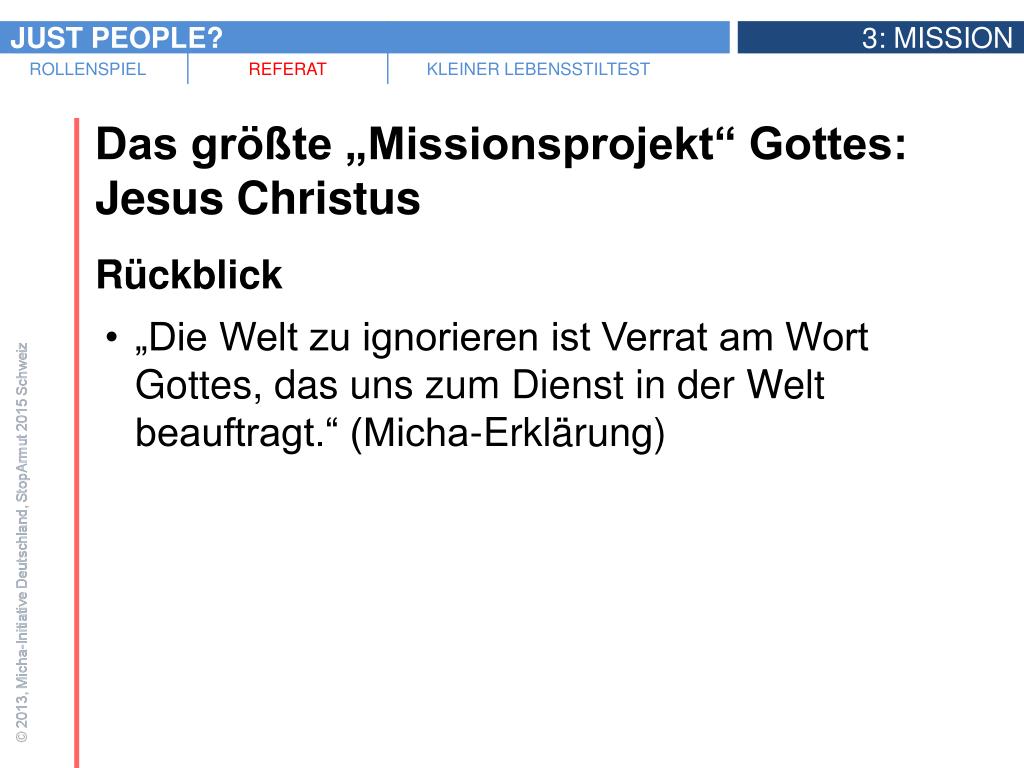 Das größte „Missionsprojekt“ Gottes: Jesus Christus • Rückblick • „Die Welt zu ignorieren ist Verrat am Wort Gottes, das uns zum Dienst in der Welt beauftragt.“ (Micha-Erklärung) • „Wie wir es im Leben Jesu sehen können, ist die Verknüpfung von Sein, Tun und Reden das Herz ganzheitlicher Mission.“(Micha-Erklärung)