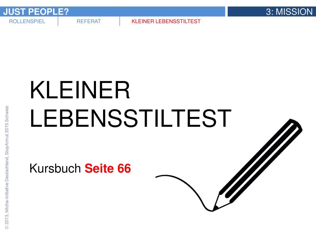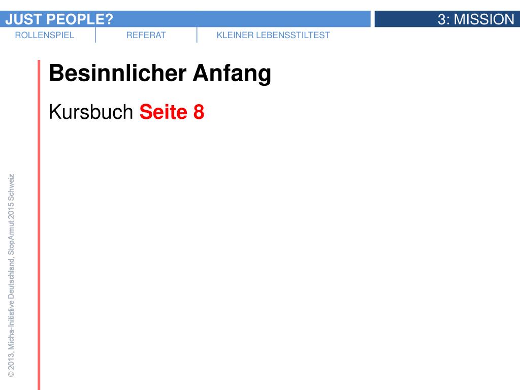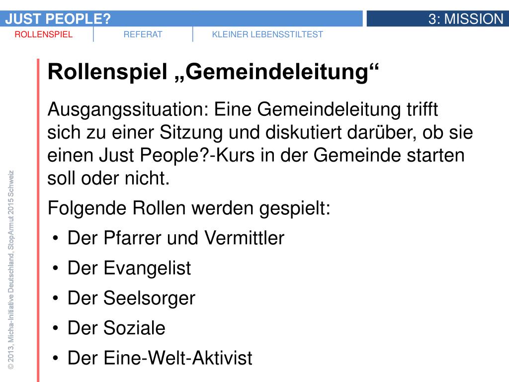 Rollenspiel „Gemeindeleitung“ • Ausgangssituation: Eine Gemeindeleitung trifft sich zu einer Sitzung und diskutiert darüber, ob sie einen Just People?-Kurs in der Gemeinde starten soll oder nicht. • Folgende Rollen werden gespielt: • Der Pfarrer und Vermittler • Der Evangelist • Der Seelsorger • Der Soziale • Der Eine-Welt-Aktivist