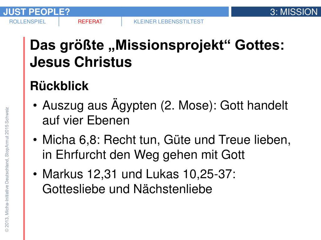 Das größte „Missionsprojekt“ Gottes: Jesus Christus • Rückblick • Auszug aus Ägypten (2. Mose): Gott handelt auf vier Ebenen • Micha 6,8: Recht tun, Güte und Treue lieben, in Ehrfurcht den Weg gehen mit Gott • Markus 12,31 und Lukas 10,25-37: Gottesliebe und Nächstenliebe