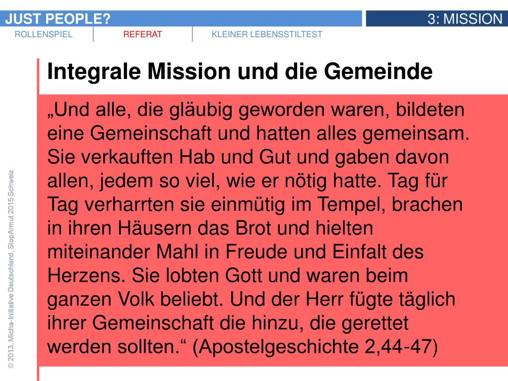 Integrale Mission und die Gemeinde • „Und alle, die gläubig geworden waren, bildeten eine Gemeinschaft und hatten alles gemeinsam. Sie verkauften Hab und Gut und gaben davon allen, jedem so viel, wie er nötig hatte. Tag für Tag verharrten sie einmütig im Tempel, brachen in ihren Häusern das Brot und hielten miteinander Mahl in Freude und Einfalt des Herzens. Sie lobten Gott und waren beim ganzen Volk beliebt. Und der Herr fügte täglich ihrer Gemeinschaft die hinzu, die gerettet werden sollten.“ (Apostelgeschichte 2,44-47)