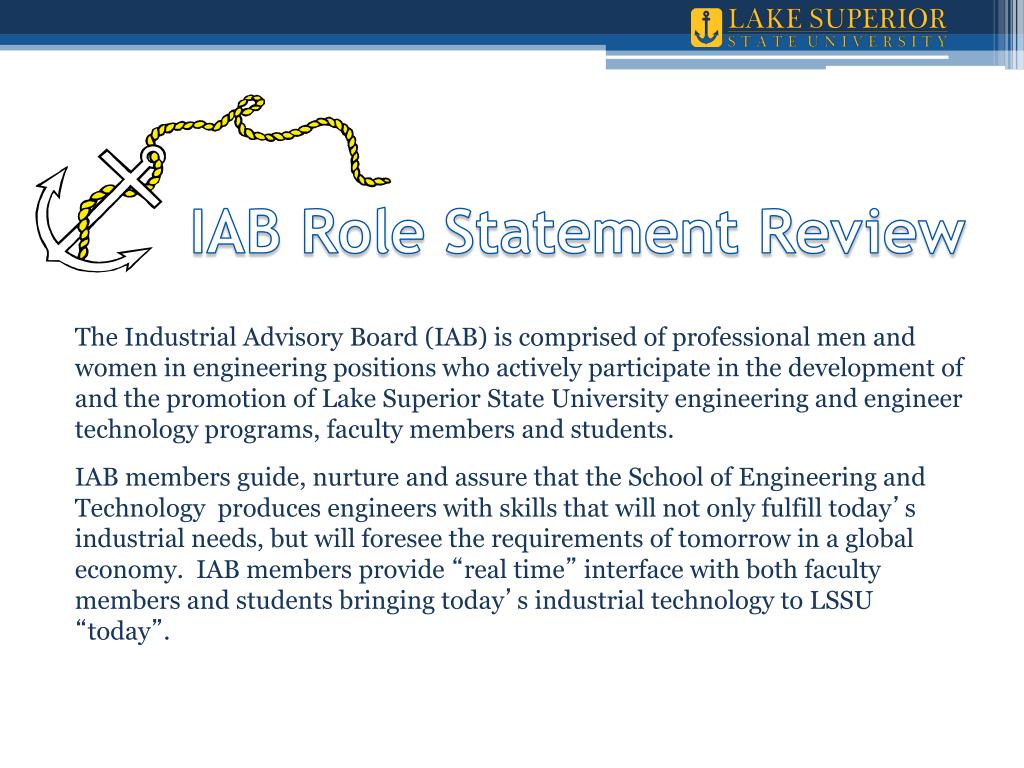 IAB Role Statement Review The Industrial Advisory Board (IAB) is comprised of professional men and women in engineering positions who actively participate in the development of and the promotion of Lake Superior State University engineering and engineer technology programs, faculty members and students. IAB members guide, nurture and assure that the School of Engineering and Technology produces engineers with skills that will not only fulfill today’s industrial needs, but will foresee the requirements of tomorrow in a global economy. IAB members provide “real time” interface with both faculty members and students bringing today’s industrial technology to LSSU “today”.