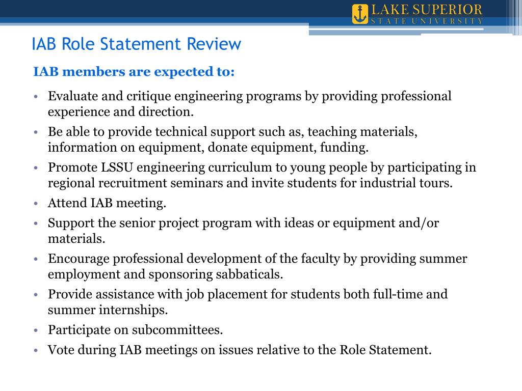 IAB Role Statement Review IAB members are expected to: • Evaluate and critique engineering programs by providing professional experience and direction. • Be able to provide technical support such as, teaching materials, information on equipment, donate equipment, funding. • Promote LSSU engineering curriculum to young people by participating in regional recruitment seminars and invite students for industrial tours. • Attend IAB meeting. • Support the senior project program with ideas or equipment and/or materials. • Encourage professional development of the faculty by providing summer employment and sponsoring sabbaticals. • Provide assistance with job placement for students both full-time and summer internships. • Participate on subcommittees. • Vote during IAB meetings on issues relative to the Role Statement.