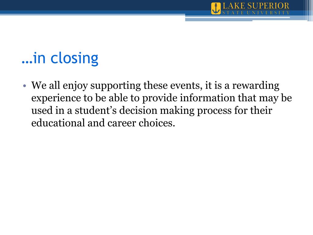 …in closing • We all enjoy supporting these events, it is a rewarding experience to be able to provide information that may be used in a student’s decision making process for their educational and career choices.