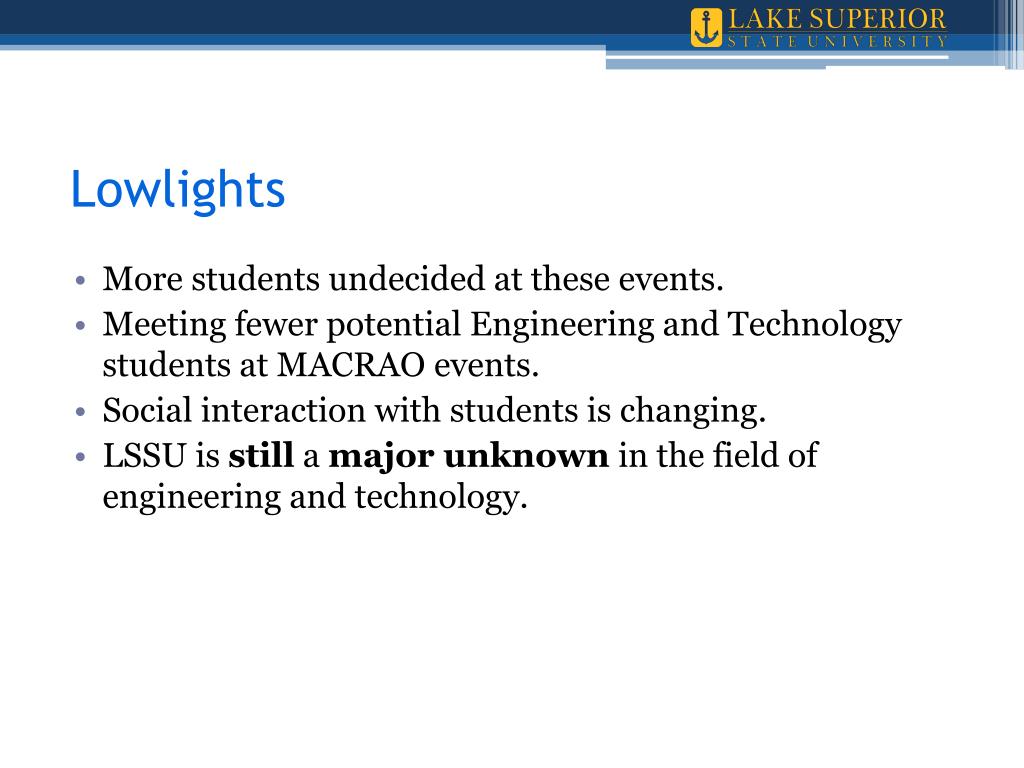 Lowlights • More students undecided at these events. • Meeting fewer potential Engineering and Technology students at MACRAO events. • Social interaction with students is changing. • LSSU is still a major unknown in the field of engineering and technology.
