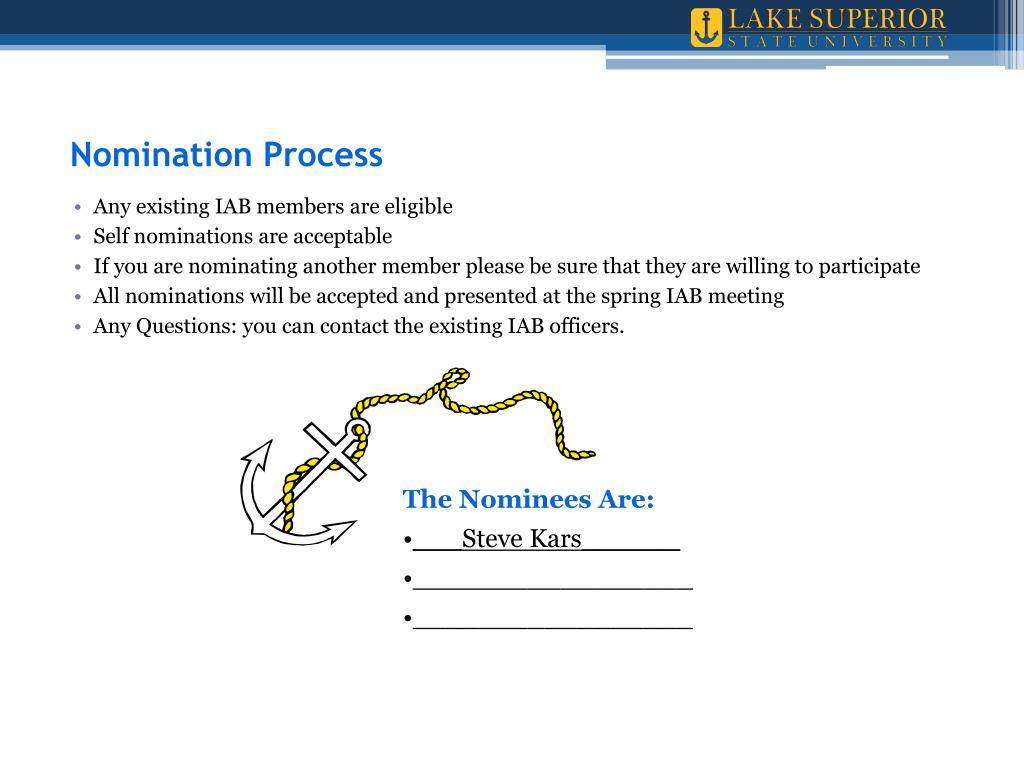Nomination Process • Any existing IAB members are eligible • Self nominations are acceptable • If you are nominating another member please be sure that they are willing to participate • All nominations will be accepted and presented at the spring IAB meeting • Any Questions: you can contact the existing IAB officers. • The Nominees Are: • ___Steve Kars______ • _________________ • _________________