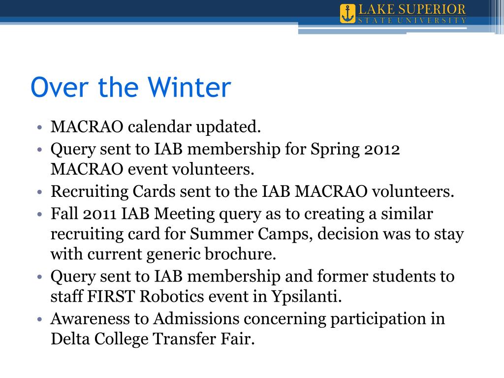 Over the Winter • MACRAO calendar updated. • Query sent to IAB membership for Spring 2012 MACRAO event volunteers. • Recruiting Cards sent to the IAB MACRAO volunteers. • Fall 2011 IAB Meeting query as to creating a similar recruiting card for Summer Camps, decision was to stay with current generic brochure. • Query sent to IAB membership and former students to staff FIRST Robotics event in Ypsilanti. • Awareness to Admissions concerning participation in Delta College Transfer Fair.