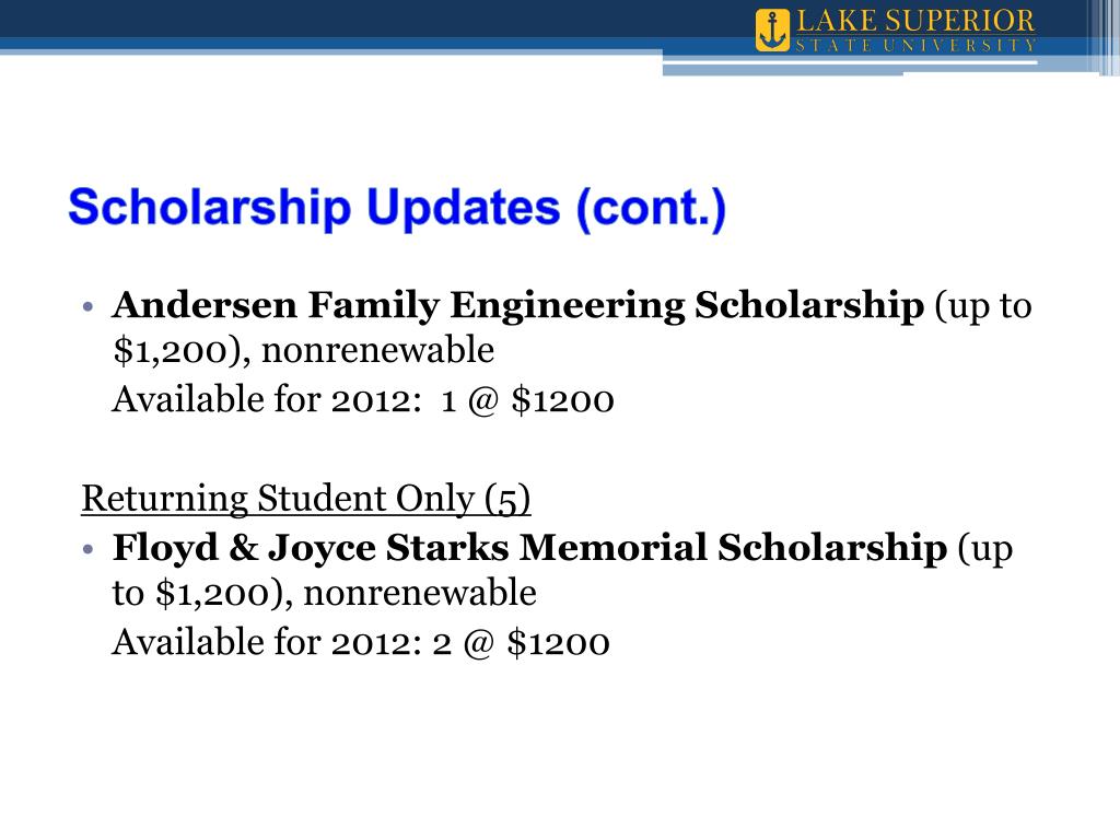 Scholarship Updates (cont.) • Andersen Family Engineering Scholarship (up to $1,200), nonrenewable Available for 2012: 1 @ $1200 Returning Student Only (5) • Floyd & Joyce Starks Memorial Scholarship (up to $1,200), nonrenewable Available for 2012: 2 @ $1200