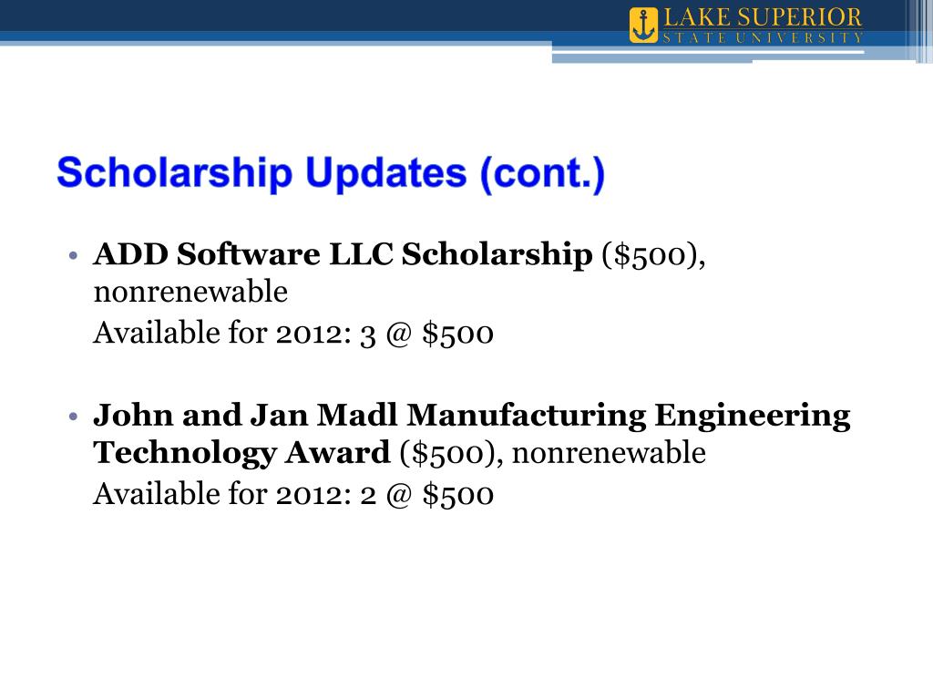 Scholarship Updates (cont.) • ADD Software LLC Scholarship ($500), nonrenewable Available for 2012: 3 @ $500 • John and Jan Madl Manufacturing Engineering Technology Award ($500), nonrenewable Available for 2012: 2 @ $500
