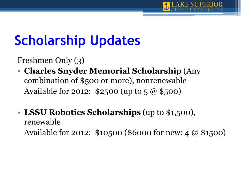 Scholarship Updates Freshmen Only (3) • Charles Snyder Memorial Scholarship (Any combination of $500 or more), nonrenewable Available for 2012: $2500 (up to 5 @ $500) • LSSU Robotics Scholarships (up to $1,500), renewable Available for 2012: $10500 ($6000 for new: 4 @ $1500)