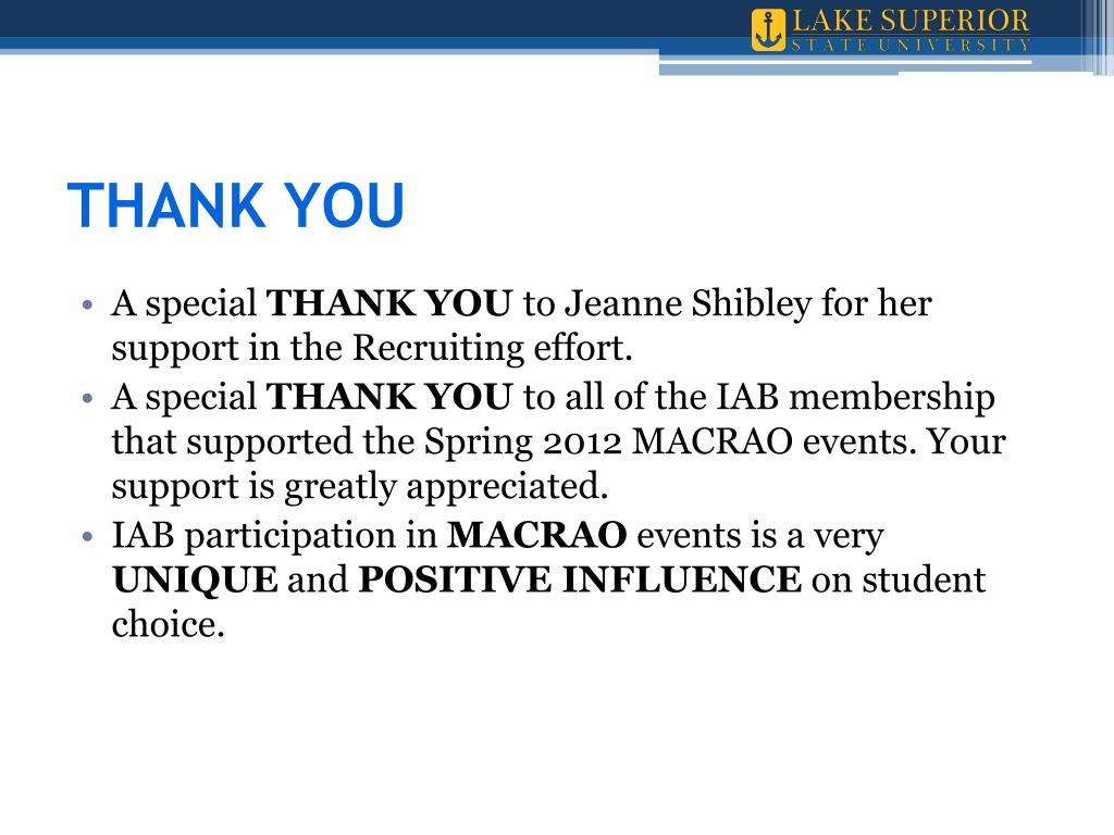 THANK YOU • A special THANK YOU to Jeanne Shibley for her support in the Recruiting effort. • A special THANK YOU to all of the IAB membership that supported the Spring 2012 MACRAO events. Your support is greatly appreciated. • IAB participation in MACRAO events is a very UNIQUE and POSITIVE INFLUENCE on student choice.