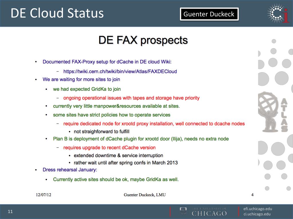 On-going work & issues • Moved US sites to r.o. LFC • SLC6 issues – X509 and VOMS attribute checking • UDP collector service with f-stream format under test • Functional testing probes & publishing into ActiveMQ and dashboards • Monitoring will have to be validated at all stages • FAX-enabled pilot site mover in production at two Tier 2s • Documentation for users & site admins • SSB and WLCG transfer dashboard with cost matrix decision algorithm • Xrootd instabilities seen in the UK cloud – perhaps related to N2N blocking at LFC • FAX extensions to ATLAS information system AGIS • Need new monitoring f-stream at all sites • Stand-alone cmsd for dcache sites • xrootd.org repository & EPEL policy (site guidance, esp. DPM) • Several dCache specific issues, and many releases under test (1.9.12-22+, 2.2.4,…); f-stream, proper stat response and checksum support from dcache-xrootd doors