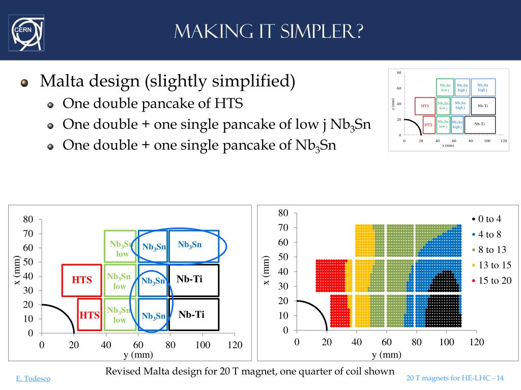 RECALL OF DESIGN • Malta layouthighlyoptimized to minimizeconductorcost • Hypothesis: cost Nb-Ti is one, Nb3Sn is 4 times, HTS is 16 times • Use Nb-Ti up to 8 T, Nb3Sn up to 13 T, HTS up to 20 T • Wealso use Nb3Sn withhalfcurrentdensityto have 2 more Tesla and reach 15 T, saving on HTS (seenext section) • Lowercost, at the price of complexity One quarter of a coil 20 T hybridmagnet: the Malta design [E. Todesco, L. Rossi]