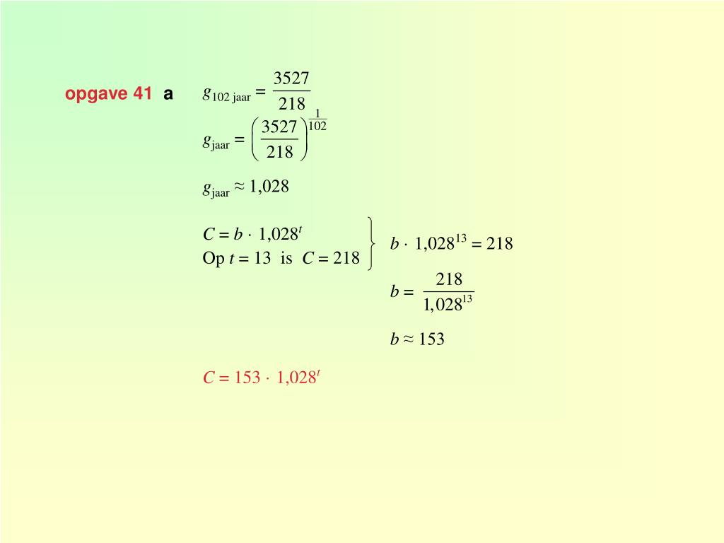 g102 jaar = gjaar = gjaar≈ 1,028 C = b · 1,028t Op t = 13 is C = 218 C = 153 · 1,028t opgave 41 a b· 1,02813 = 218 b = b ≈ 153