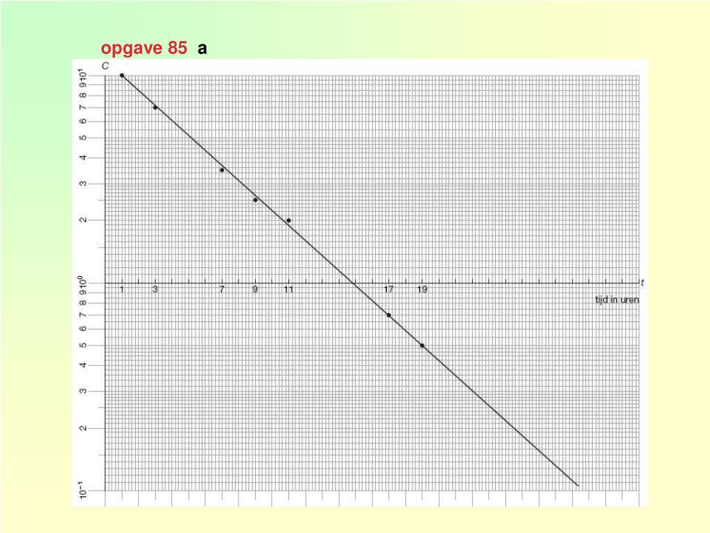 opgave 85 b Rechte lijn op logaritmisch papier, dus C = b · gt. t = 1 en C = 10 t = 19 en C = 0,5 C = b · 0,847t t = 1 en C = 10 Dus C = 11,8 · 0,847t. g18 uur = = 0,05 ≈ 0,847 guur = b· 0,8471 = 10 b = ≈ 11,81