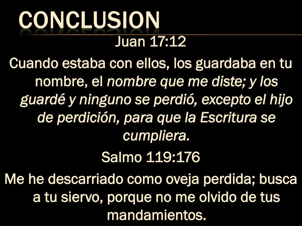 Juan 17:12 Cuando estaba con ellos, los guardaba en tu nombre, el nombre que me diste; y los guardé y ninguno se perdió, excepto el hijo de perdición, para que la Escritura se cumpliera. Salmo 119:176 Me he descarriado como oveja perdida; busca a tu siervo, porque no me olvido de tus mandamientos. CONCLUSION