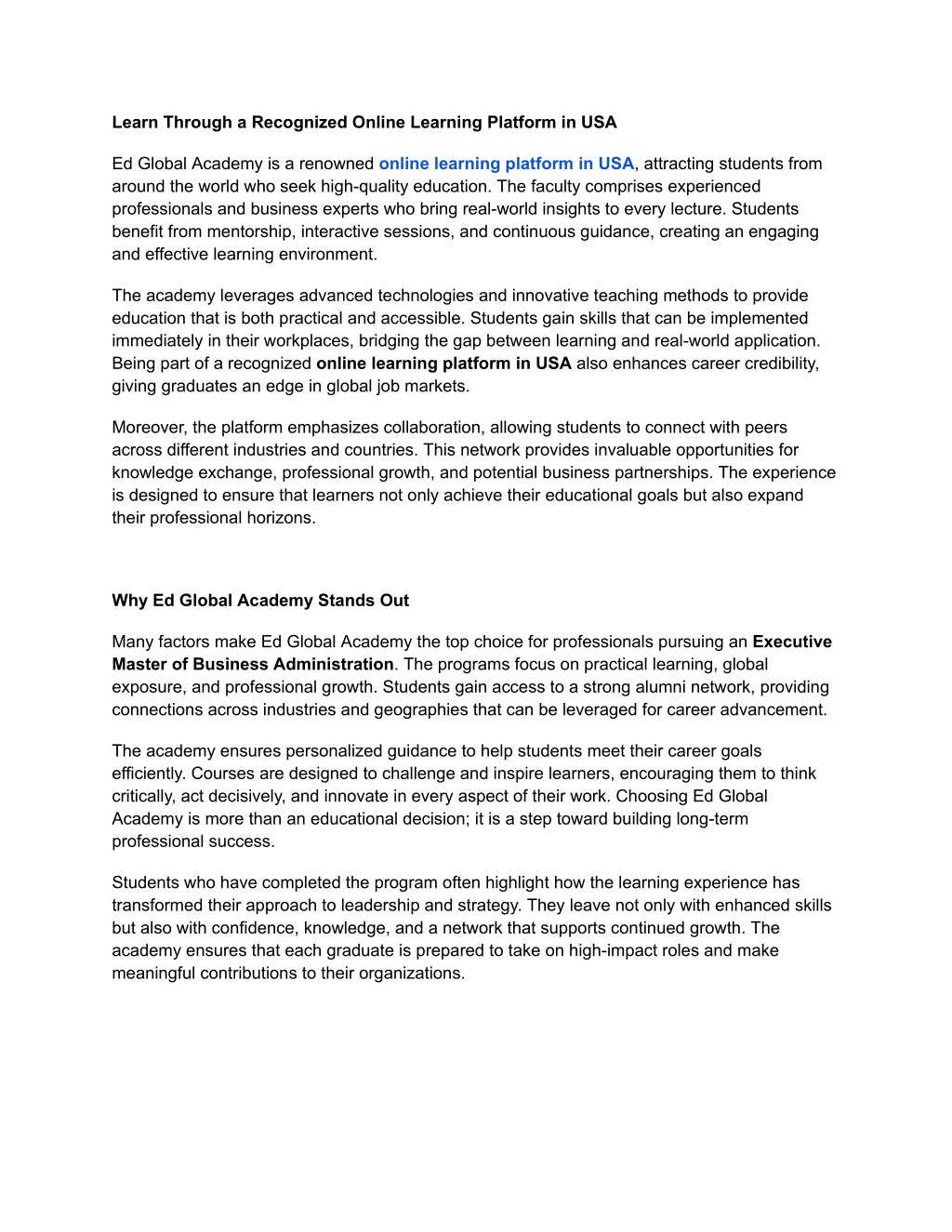 Learn Through a Recognized Online Learning Platform in USA Ed Global Academy is a renowned online learning platform in USA, attracting students from around the world who seek high-quality education. The faculty comprises experienced professionals and business experts who bring real-world insights to every lecture. Students benefit from mentorship, interactive sessions, and continuous guidance, creating an engaging and effective learning environment. The academy leverages advanced technologies and innovative teaching methods to provide education that is both practical and accessible. Students gain skills that can be implemented immediately in their workplaces, bridging the gap between learning and real-world application. Being part of a recognized online learning platform in USA also enhances career credibility, giving graduates an edge in global job markets. Moreover, the platform emphasizes collaboration, allowing students to connect with peers across different industries and countries. This network provides invaluable opportunities for knowledge exchange, professional growth, and potential business partnerships. The experience is designed to ensure that learners not only achieve their educational goals but also expand their professional horizons. Why Ed Global Academy Stands Out Many factors make Ed Global Academy the top choice for professionals pursuing an Executive Master of Business Administration. The programs focus on practical learning, global exposure, and professional growth. Students gain access to a strong alumni network, providing connections across industries and geographies that can be leveraged for career advancement. The academy ensures personalized guidance to help students meet their career goals efficiently. Courses are designed to challenge and inspire learners, encouraging them to think critically, act decisively, and innovate in every aspect of their work. Choosing Ed Global Academy is more than an educational decision; it is a step toward building long-term professional success. Students who have completed the program often highlight how the learning experience has transformed their approach to leadership and strategy. They leave not only with enhanced skills but also with confidence, knowledge, and a network that supports continued growth. The academy ensures that each graduate is prepared to take on high-impact roles and make meaningful contributions to their organizations.