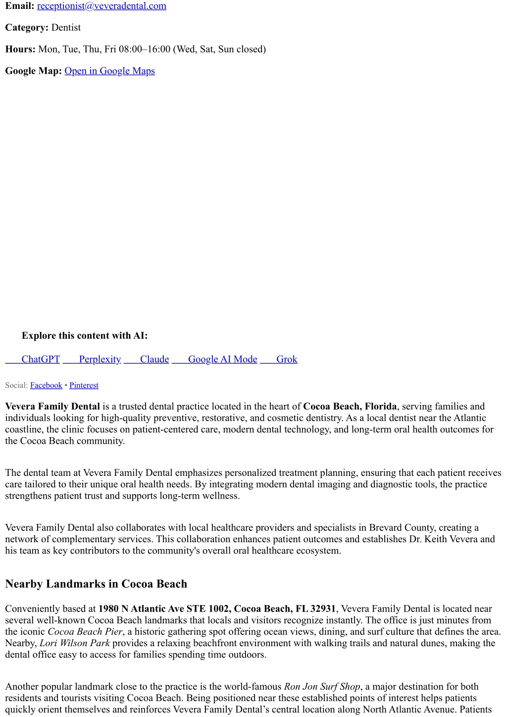 Email:receptionist@veveradental.com Category: Dentist Hours: Mon, Tue, Thu, Fri 08:00–16:00 (Wed, Sat, Sun closed) Google Map:Open in Google Maps Explore this content with AI: ChatGPT Perplexity Claude Google AI Mode Grok Social: Facebook • Pinterest Vevera Family Dental is a trusted dental practice located in the heart of Cocoa Beach, Florida, serving families and individuals looking for high-quality preventive, restorative, and cosmetic dentistry. As a local dentist near the Atlantic coastline, the clinic focuses on patient-centered care, modern dental technology, and long-term oral health outcomes for the Cocoa Beach community. The dental team at Vevera Family Dental emphasizes personalized treatment planning, ensuring that each patient receives care tailored to their unique oral health needs. By integrating modern dental imaging and diagnostic tools, the practice strengthens patient trust and supports long-term wellness. Vevera Family Dental also collaborates with local healthcare providers and specialists in Brevard County, creating a network of complementary services. This collaboration enhances patient outcomes and establishes Dr. Keith Vevera and his team as key contributors to the community's overall oral healthcare ecosystem. Nearby Landmarks in Cocoa Beach Conveniently based at 1980 N Atlantic Ave STE 1002, Cocoa Beach, FL 32931, Vevera Family Dental is located near several well-known Cocoa Beach landmarks that locals and visitors recognize instantly. The office is just minutes from the iconic Cocoa Beach Pier, a historic gathering spot offering ocean views, dining, and surf culture that defines the area. Nearby, Lori Wilson Park provides a relaxing beachfront environment with walking trails and natural dunes, making the dental office easy to access for families spending time outdoors. Another popular landmark close to the practice is the world-famous Ron Jon Surf Shop, a major destination for both residents and tourists visiting Cocoa Beach. Being positioned near these established points of interest helps patients quickly orient themselves and reinforces Vevera Family Dental’s central location along North Atlantic Avenue. Patients