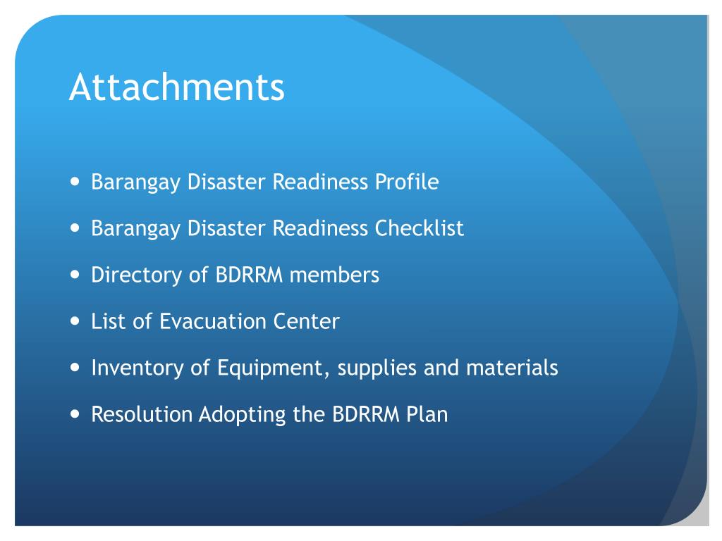 Attachments • Barangay Disaster Readiness Profile • Barangay Disaster Readiness Checklist • Directory of BDRRM members • List of Evacuation Center • Inventory of Equipment, supplies and materials • Resolution Adopting the BDRRM Plan