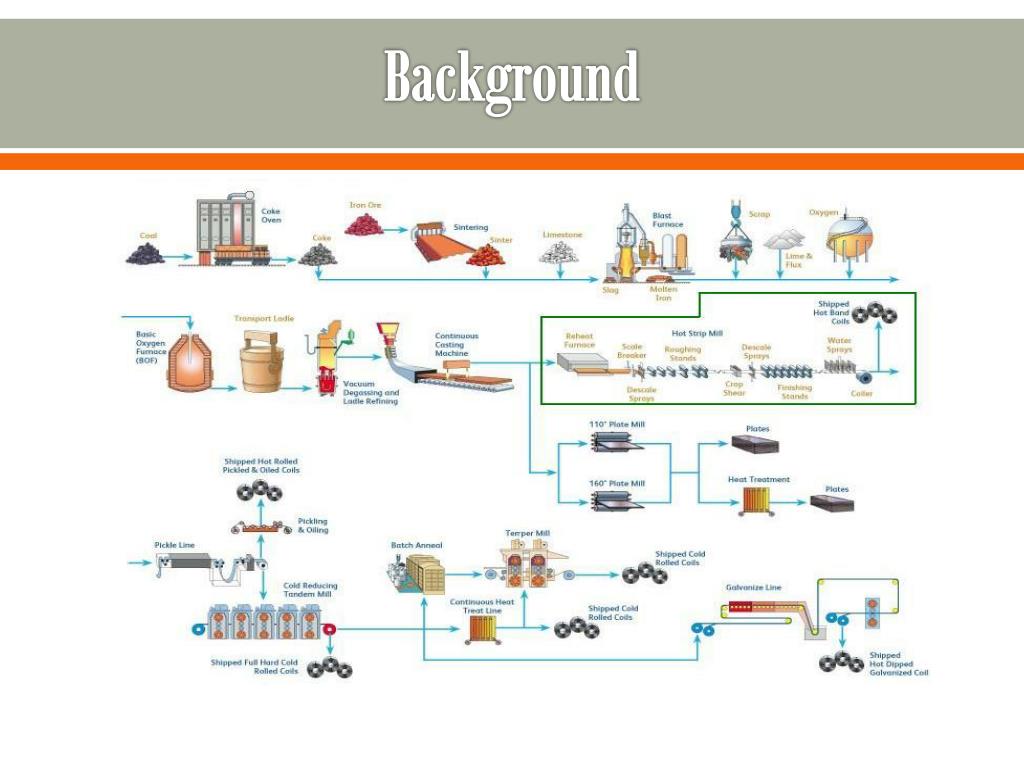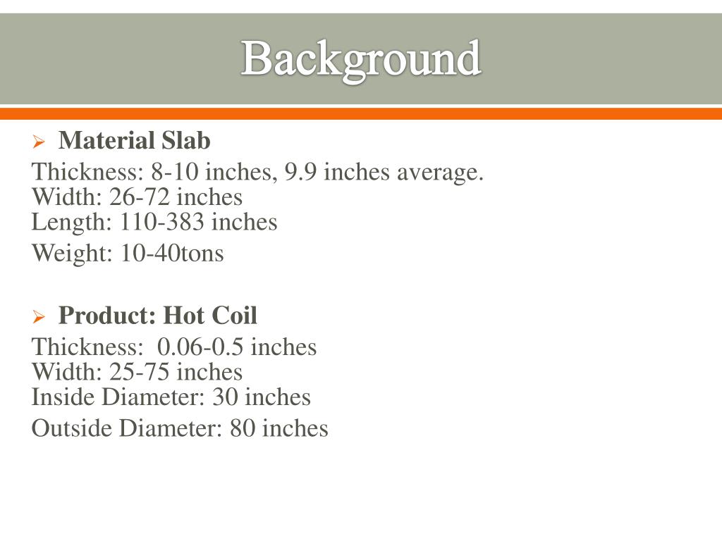 Background • Material Slab Thickness: 8-10 inches, 9.9 inches average.Width: 26-72 inchesLength: 110-383 inches Weight: 10-40tons • Product: Hot Coil Thickness: 0.06-0.5 inchesWidth: 25-75 inchesInside Diameter: 30 inches Outside Diameter: 80 inches