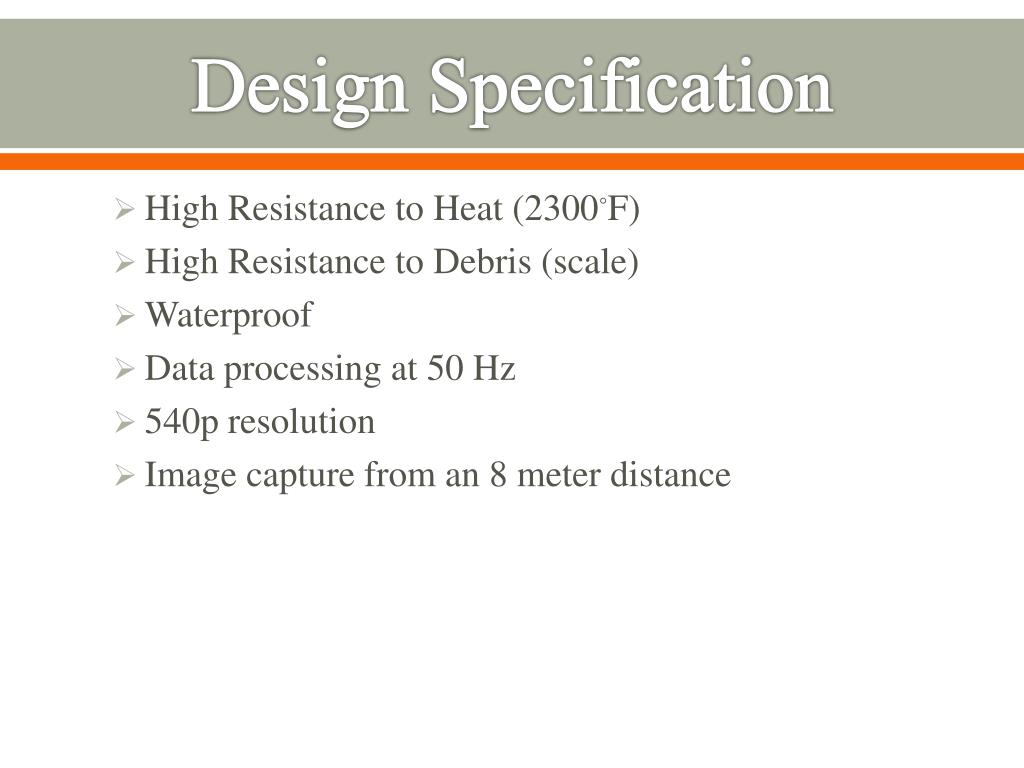 Design Specification • High Resistance to Heat (2300◦F) • High Resistance to Debris (scale) • Waterproof • Data processing at 50 Hz • 540p resolution • Image capture from an 8 meter distance