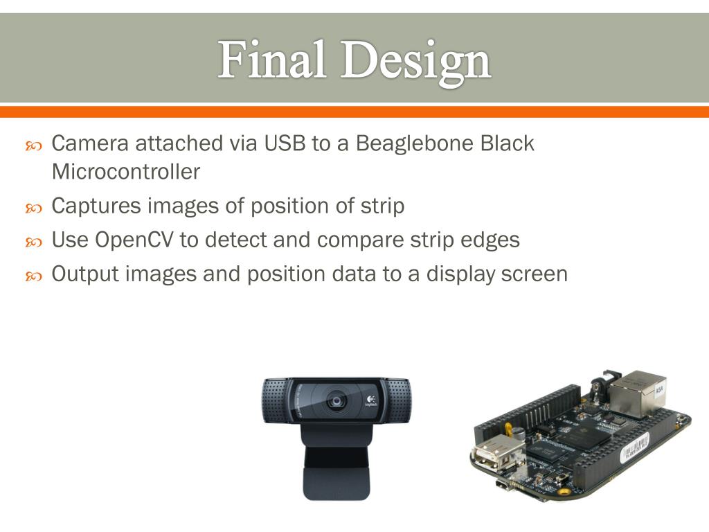 Final Design • Camera attached via USB to a Beaglebone Black Microcontroller • Captures images of position of strip • Use OpenCV to detect and compare strip edges • Output images and position data to a display screen