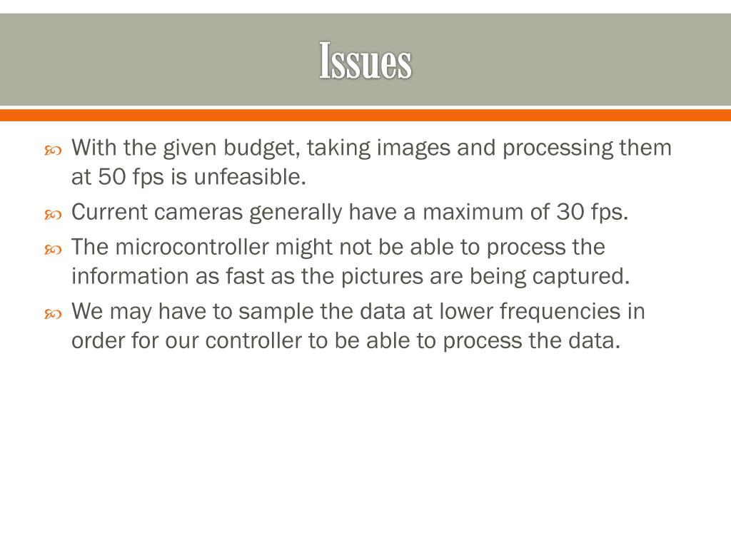 Issues • With the given budget, taking images and processing them at 50 fps is unfeasible. • Current cameras generally have a maximum of 30 fps. • The microcontroller might not be able to process the information as fast as the pictures are being captured. • We may have to sample the data at lower frequencies in order for our controller to be able to process the data.