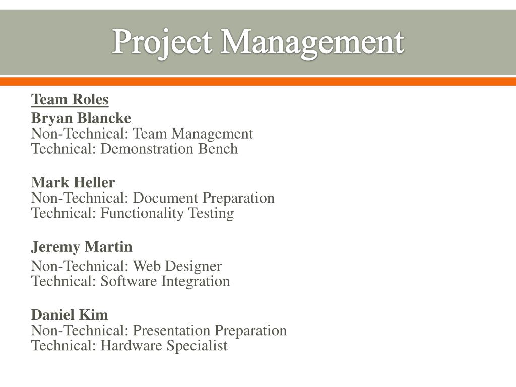 Project Management Team Roles Bryan BlanckeNon-Technical: Team ManagementTechnical: Demonstration Bench Mark HellerNon-Technical: Document PreparationTechnical: Functionality Testing Jeremy Martin Non-Technical: Web DesignerTechnical: Software Integration Daniel KimNon-Technical: Presentation PreparationTechnical: Hardware Specialist