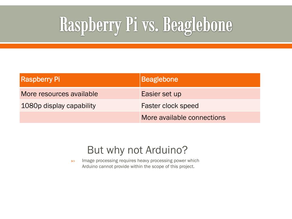 Raspberry Pi vs. Beaglebone But why not Arduino? • Image processing requires heavy processing power which Arduino cannot provide within the scope of this project.