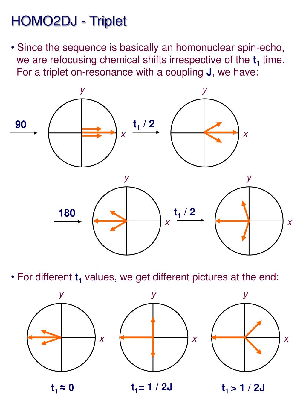 HOMO2DJ - Triplet • Since the sequence is basically an homonuclear spin-echo, • we are refocusing chemical shifts irrespective of the t1 time. • For a triplet on-resonance with a coupling J, we have: • For different t1values, we get different pictures at the end: y y t1 / 2 90 x x y y t1 / 2 180 x x y y y x x x t1= 1 / 2J t1 ≈ 0 t1 > 1 / 2J