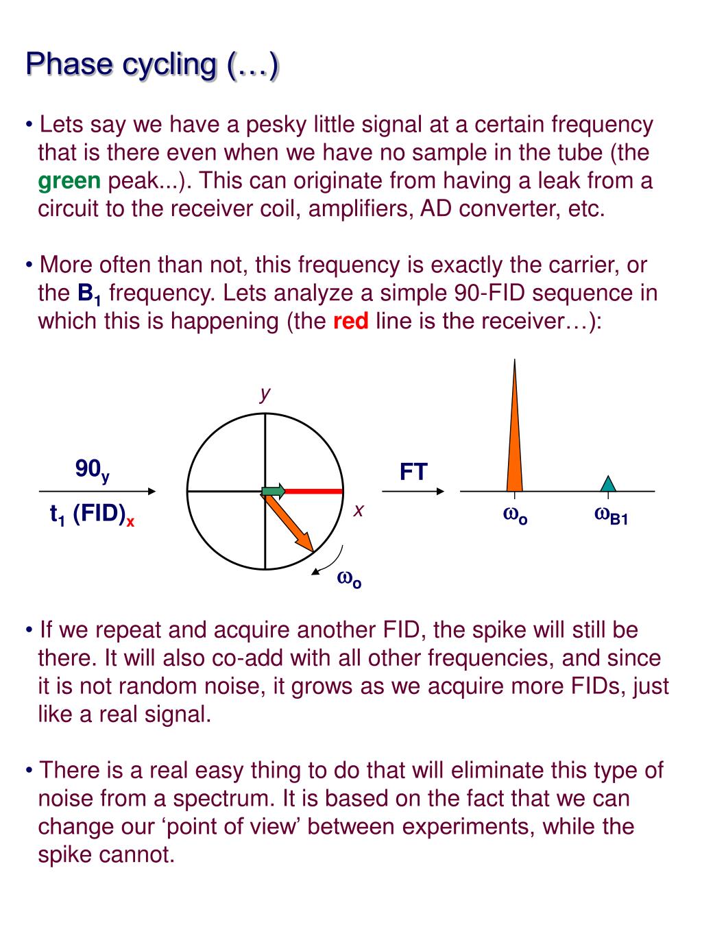 Phase cycling (…) • The procedure of changing our ‘point of view’ is called phase • cycling, and it involves shifting the phase of the pulses and/or • the receiver by a controlled amount between experiments. • In order to eliminate the spike, we do the following. We first • take an FID using a 90y pulse and the receiver in the <x> • axis just as shown in the previous slide. Then we shift the • phase of the 90 pulse by 180 degrees (90-y), and the receiver • also by 180 degrees to the <-x> axis (again, the red line…): • Now if we co-add the spectra (or FIDs), the signal at wB1 will • have alternating sign between successive scans, and it will • be canceled out after addition: y wo 90-y t1 (FID)-x FT wB1 x wo + = wB1 wo wB1 wo wo wB1