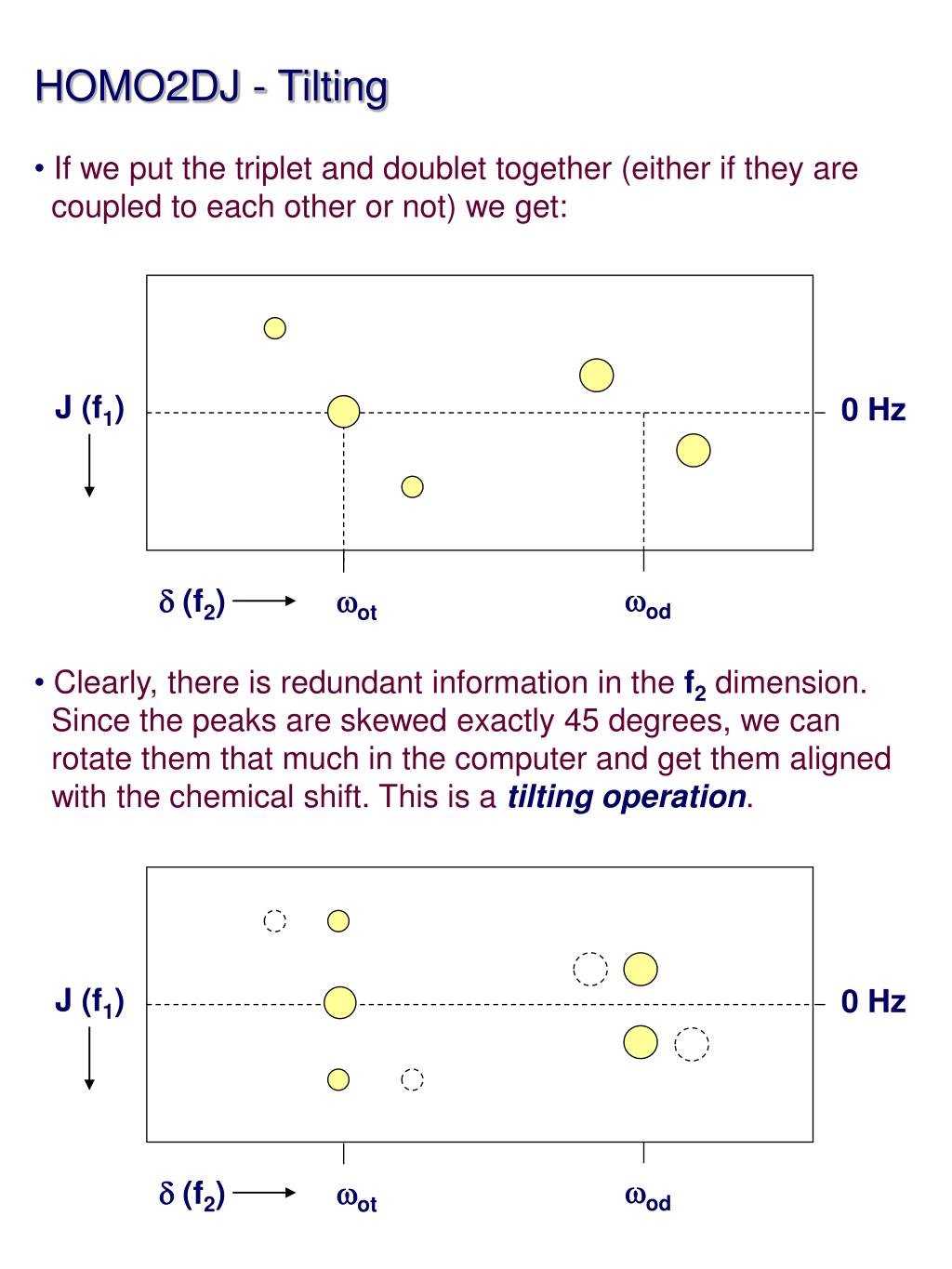 HOMO2DJ - Tilting • If we put the triplet and doublet together (either if they are • coupled to each other or not) we get: • Clearly, there is redundant information in the f2 dimension. • Since the peaks are skewed exactly 45 degrees, we can • rotate them that much in the computer and get them aligned • with the chemical shift. This is a tilting operation. J (f1) 0 Hz wod d (f2) wot J (f1) 0 Hz wod d (f2) wot
