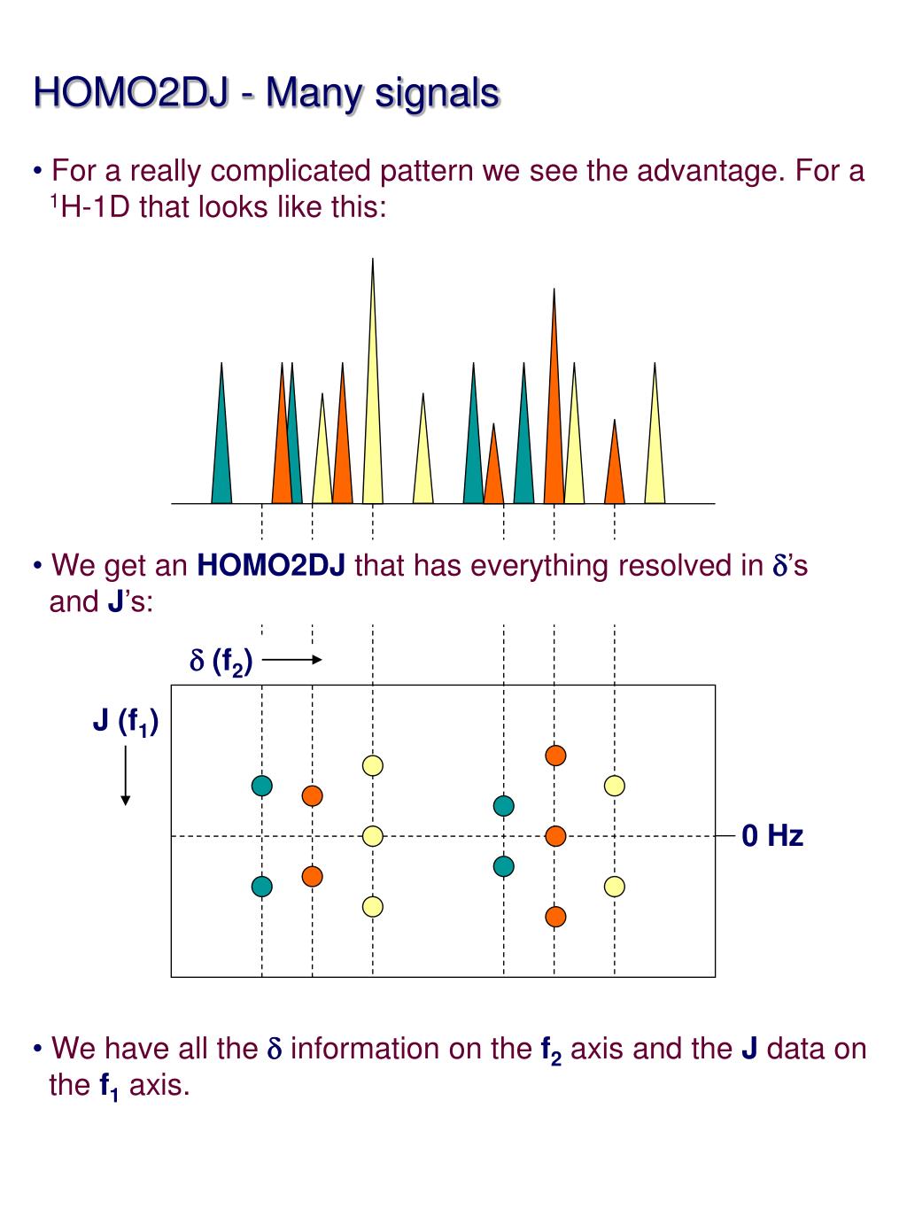 HOMO2DJ - Many signals • For a really complicated pattern we see the advantage. For a • 1H-1D that looks like this: • We have all the d information on the f2 axis and the J data on • the f1 axis. • We get an HOMO2DJ that has everything resolved in d’s • and J’s: d (f2) J (f1) 0 Hz