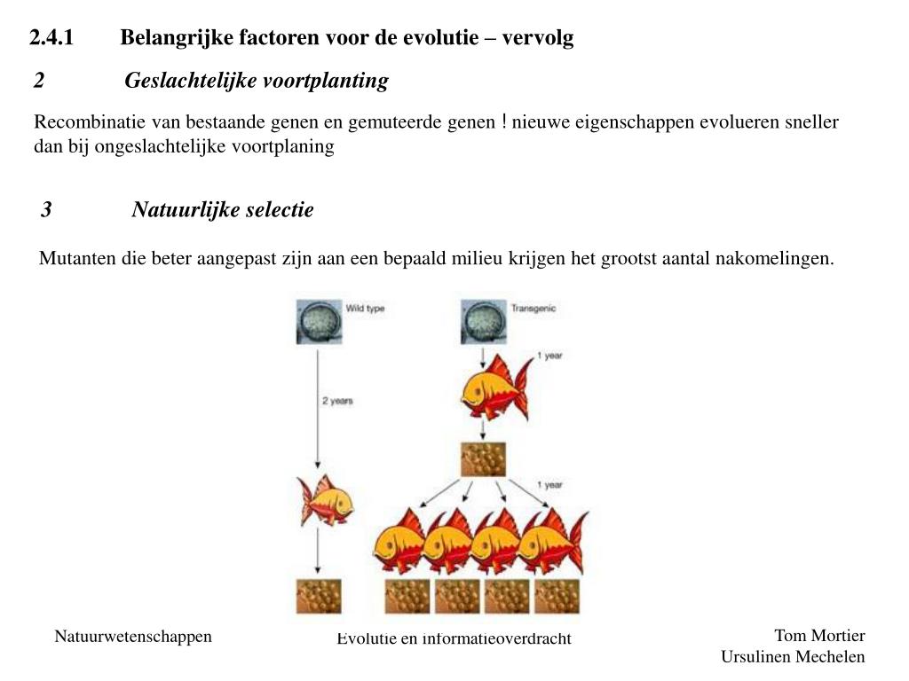 2.4.1 Belangrijke factoren voor de evolutie – vervolg 2 Geslachtelijke voortplanting Recombinatie van bestaande genen en gemuteerde genen ! nieuwe eigenschappen evolueren sneller dan bij ongeslachtelijke voortplaning 3 Natuurlijke selectie Mutanten die beter aangepast zijn aan een bepaald milieu krijgen het grootst aantal nakomelingen. Evolutie en informatieoverdracht