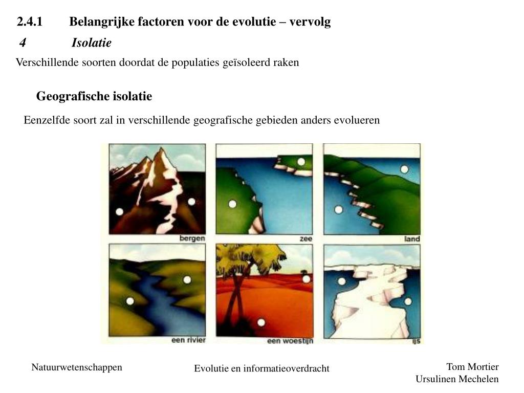 2.4.1 Belangrijke factoren voor de evolutie – vervolg 4 Isolatie Verschillende soorten doordat de populaties geïsoleerd raken Geografische isolatie Eenzelfde soort zal in verschillende geografische gebieden anders evolueren Evolutie en informatieoverdracht
