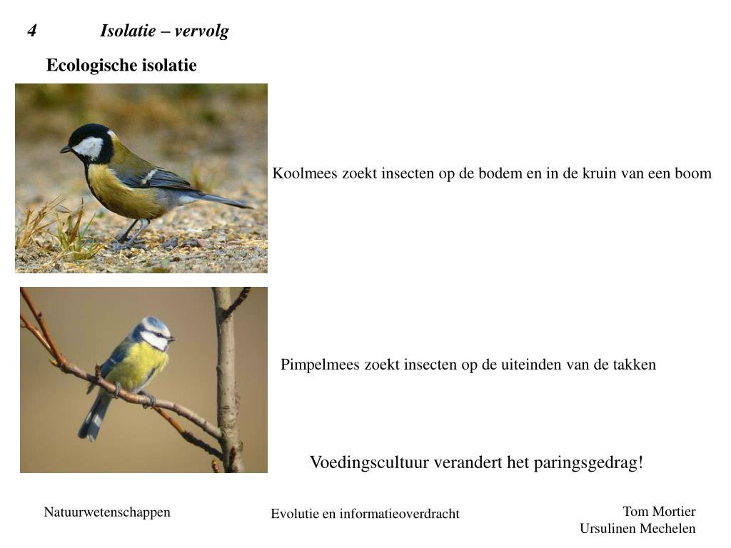 4 Isolatie – vervolg Ecologische isolatie Koolmees zoekt insecten op de bodem en in de kruin van een boom Pimpelmees zoekt insecten op de uiteinden van de takken Voedingscultuur verandert het paringsgedrag! Evolutie en informatieoverdracht