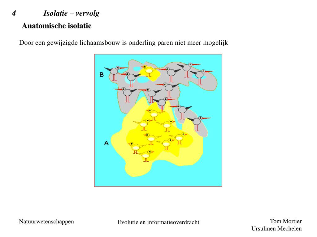 4 Isolatie – vervolg Anatomische isolatie Door een gewijzigde lichaamsbouw is onderling paren niet meer mogelijk Evolutie en informatieoverdracht