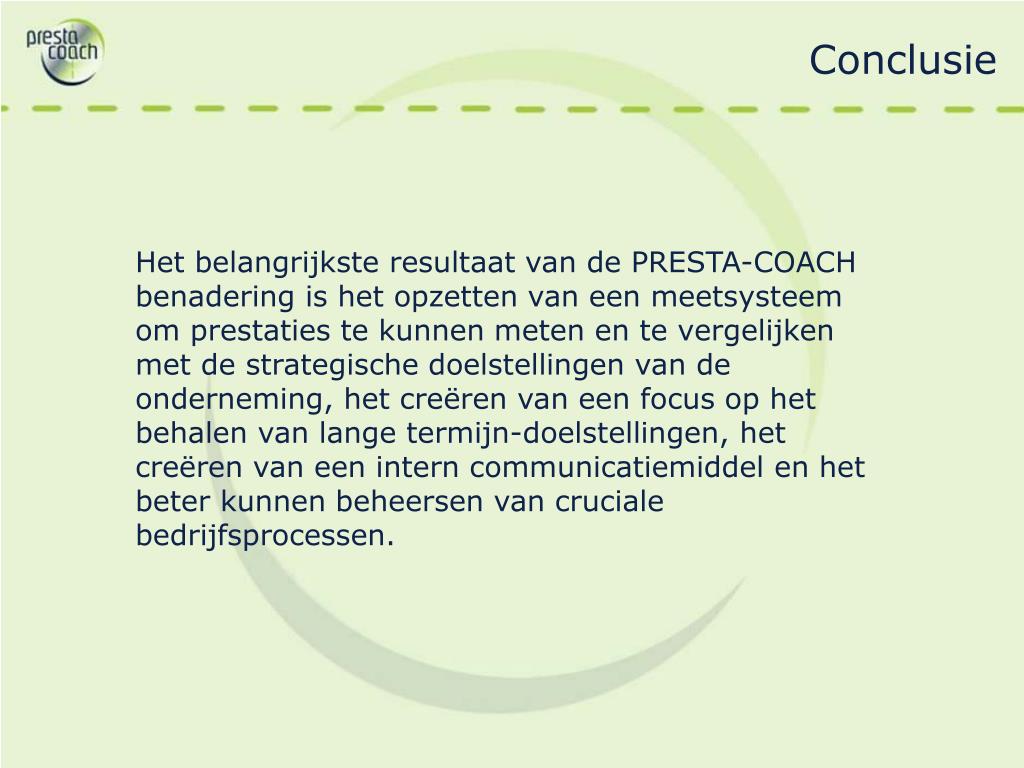 Conclusie Het belangrijkste resultaat van de PRESTA-COACH benadering is het opzetten van een meetsysteem om prestaties te kunnen meten en te vergelijken met de strategische doelstellingen van de onderneming, het creëren van een focus op het behalen van lange termijn-doelstellingen, het creëren van een intern communicatiemiddel en het beter kunnen beheersen van cruciale bedrijfsprocessen.