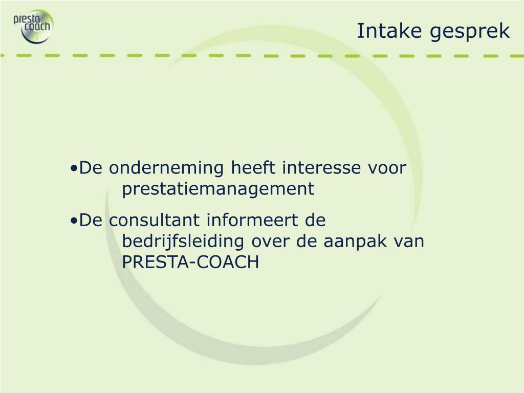 Intake gesprek • De onderneming heeft interesse voor prestatiemanagement • De consultant informeert de bedrijfsleiding over de aanpak van PRESTA-COACH