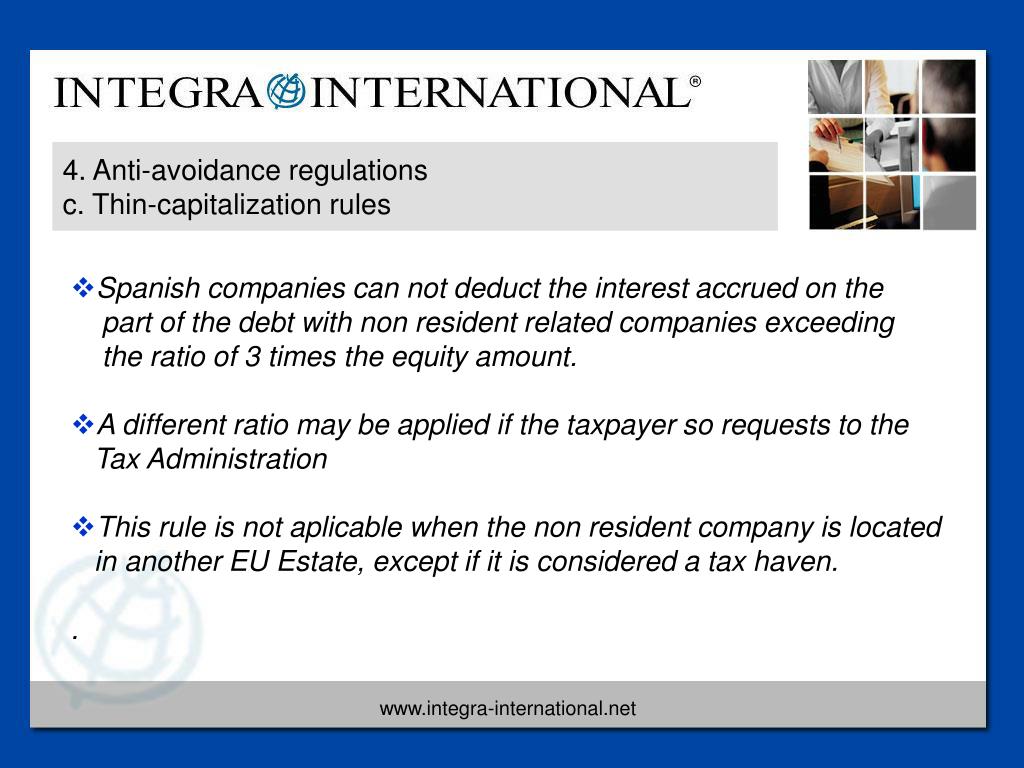 4. Anti-avoidance regulations c. Thin-capitalization rules • Spanish companies can not deduct the interest accrued on the part of the debt with non resident related companies exceeding the ratio of 3 times the equity amount. • A different ratio may be applied if the taxpayer so requests to the Tax Administration • This rule is not aplicable when the non resident company is located in another EU Estate, except if it is considered a tax haven. .