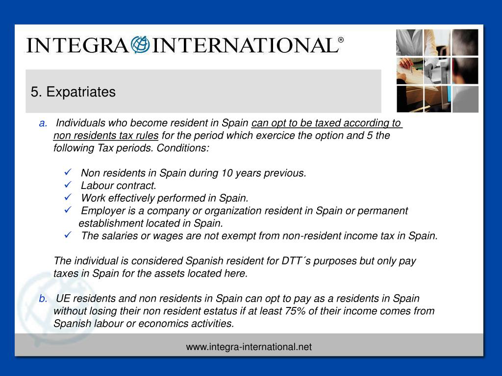 5. Expatriates • Individuals who become resident in Spain can opt to be taxed according to non residents tax rules for the period which exercice the option and 5 the following Tax periods. Conditions: • Non residents in Spain during 10 years previous. • Labour contract. • Work effectively performed in Spain. • Employer is a company or organization resident in Spain or permanent establishment located in Spain. • The salaries or wages are not exempt from non-resident income tax in Spain. The individual is considered Spanish resident for DTT´s purposes but only pay taxes in Spain for the assets located here. • UE residents and non residents in Spain can opt to pay as a residents in Spain without losing their non resident estatus if at least 75% of their income comes from Spanish labour or economics activities.